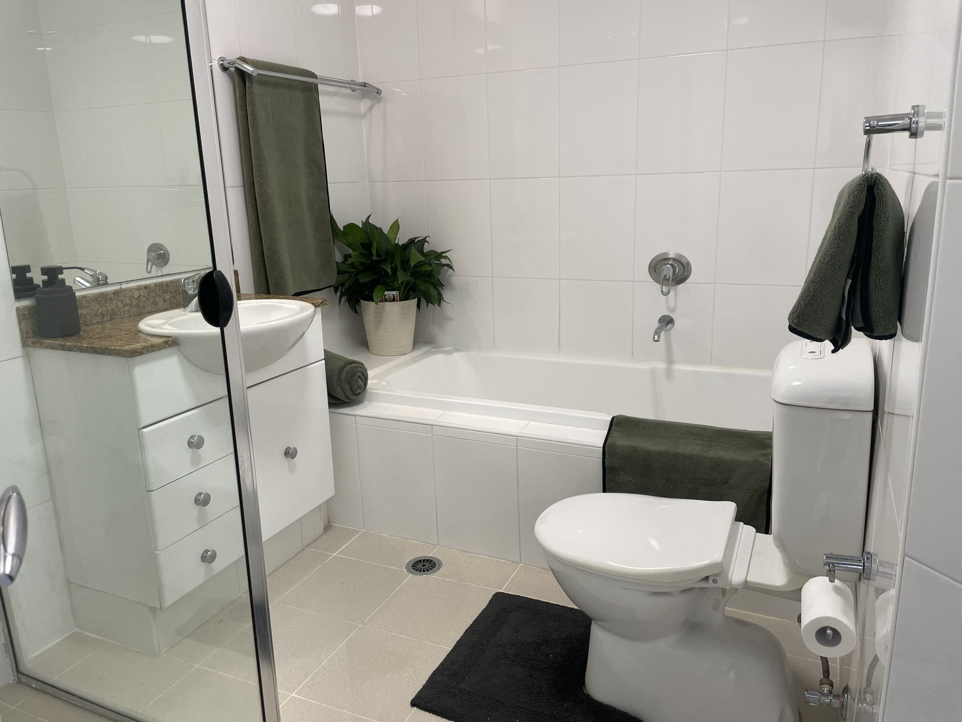 • Well-maintained bathroom with separate shower and bathtub.