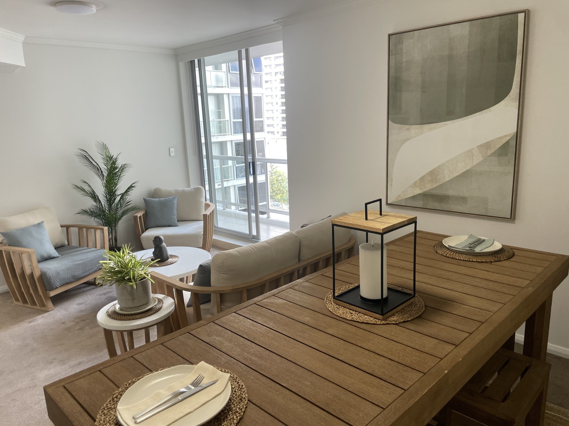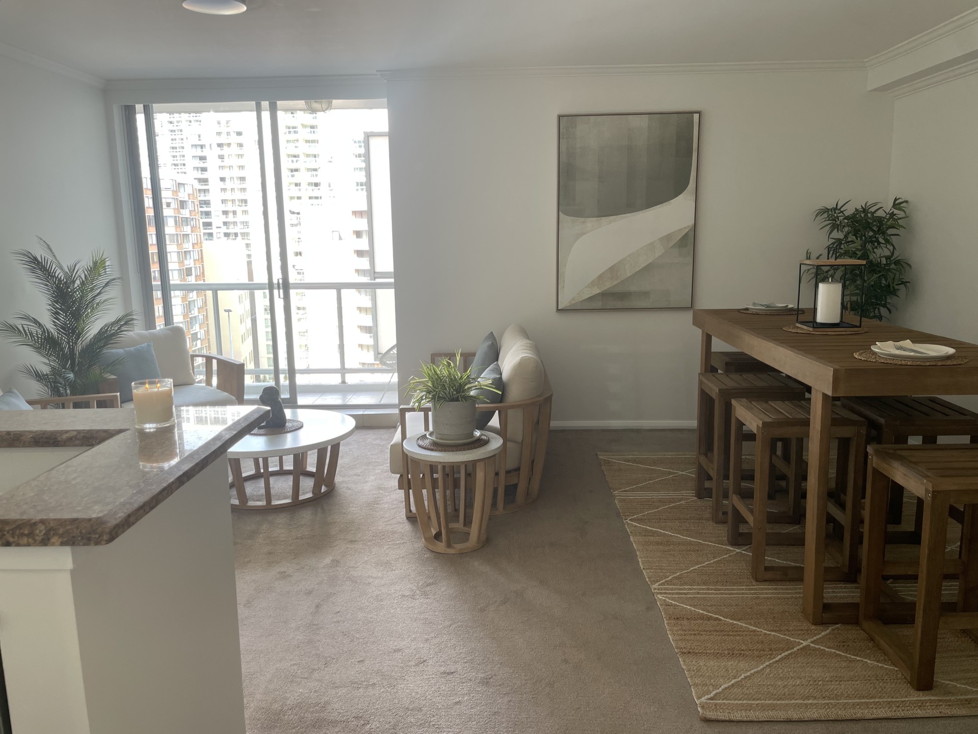 • Large open-plan living and dining area opening out to balcony with city views.