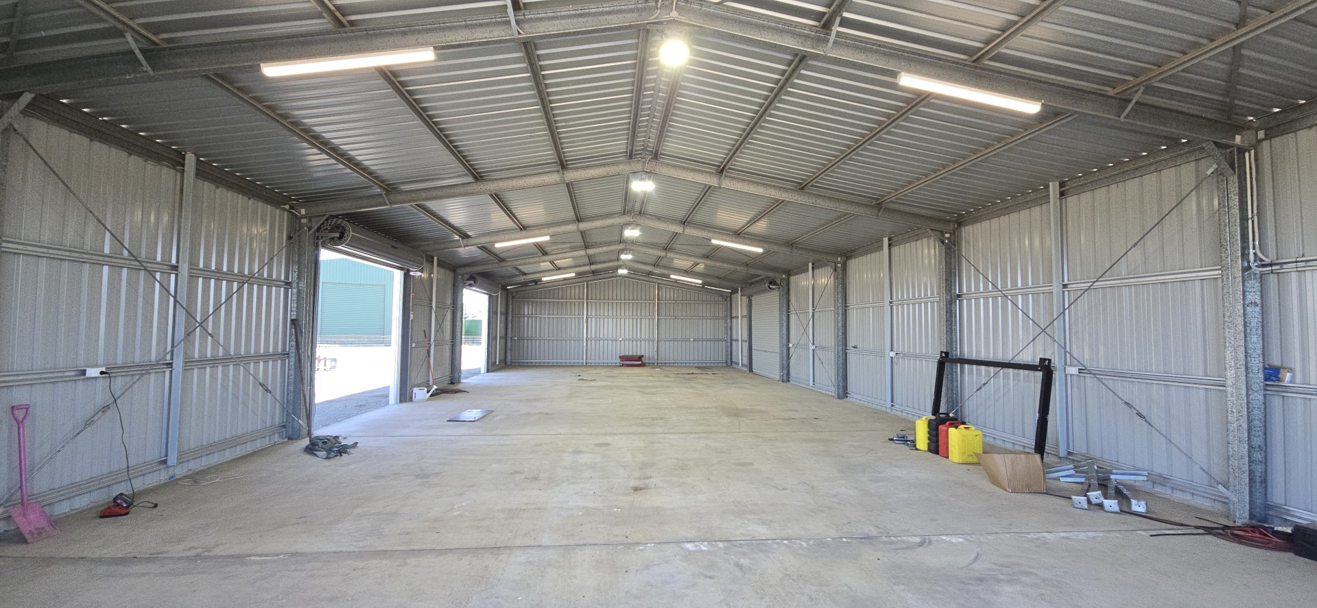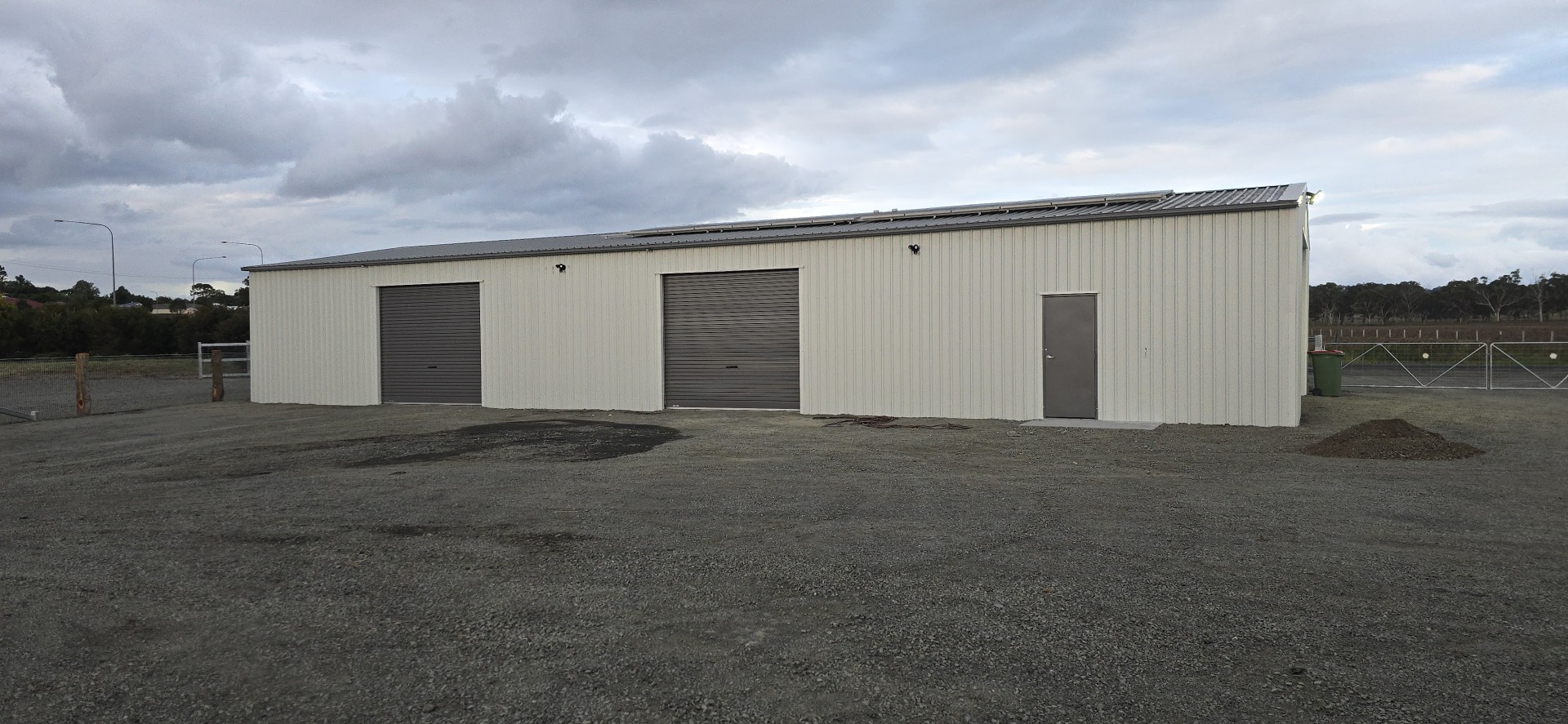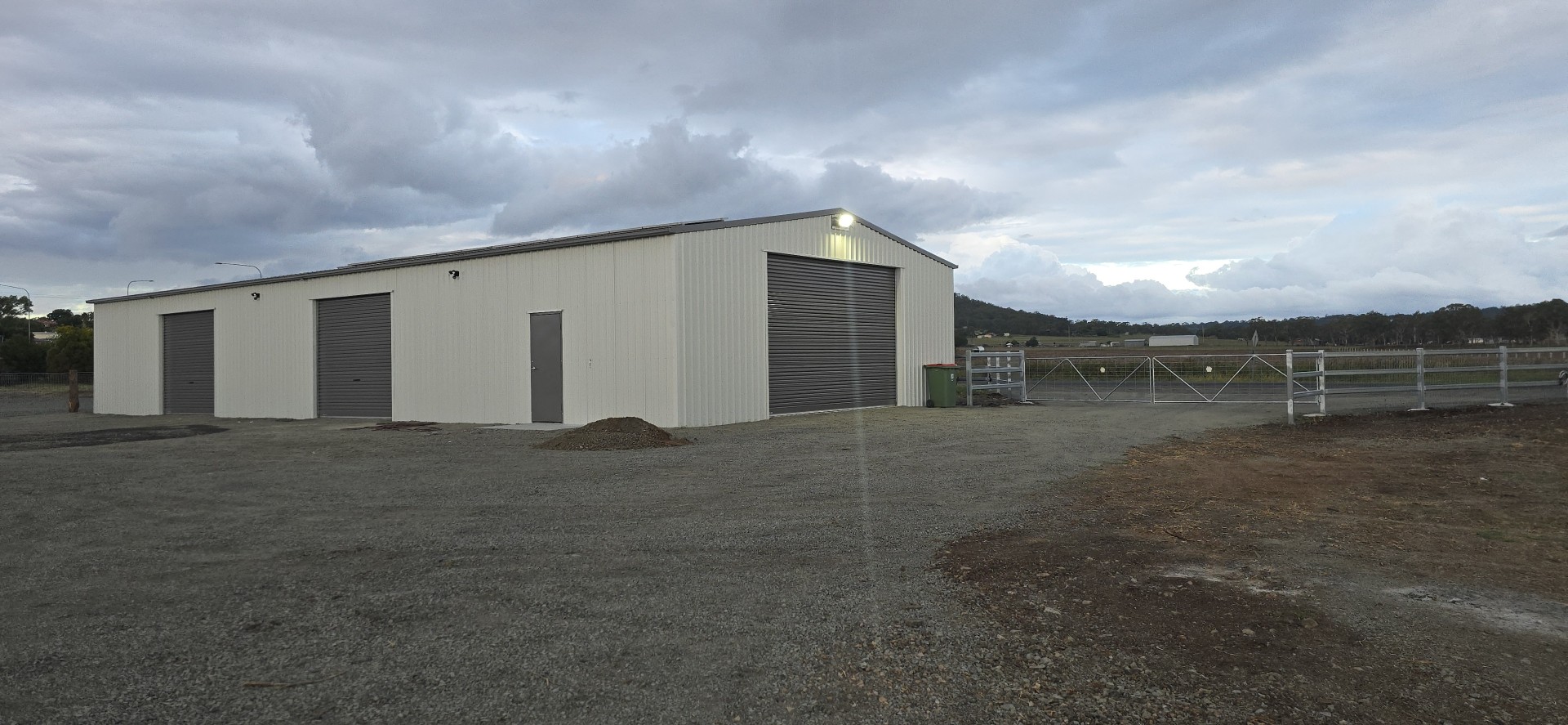 Large 240m² workshop shed with 3 x 3 x 2.8m roller doors, 1 x 5 x 3.2m roller door, motorised roller door, LED hi-bay lighting - perfect for machinery, vehicles, or additional storage.