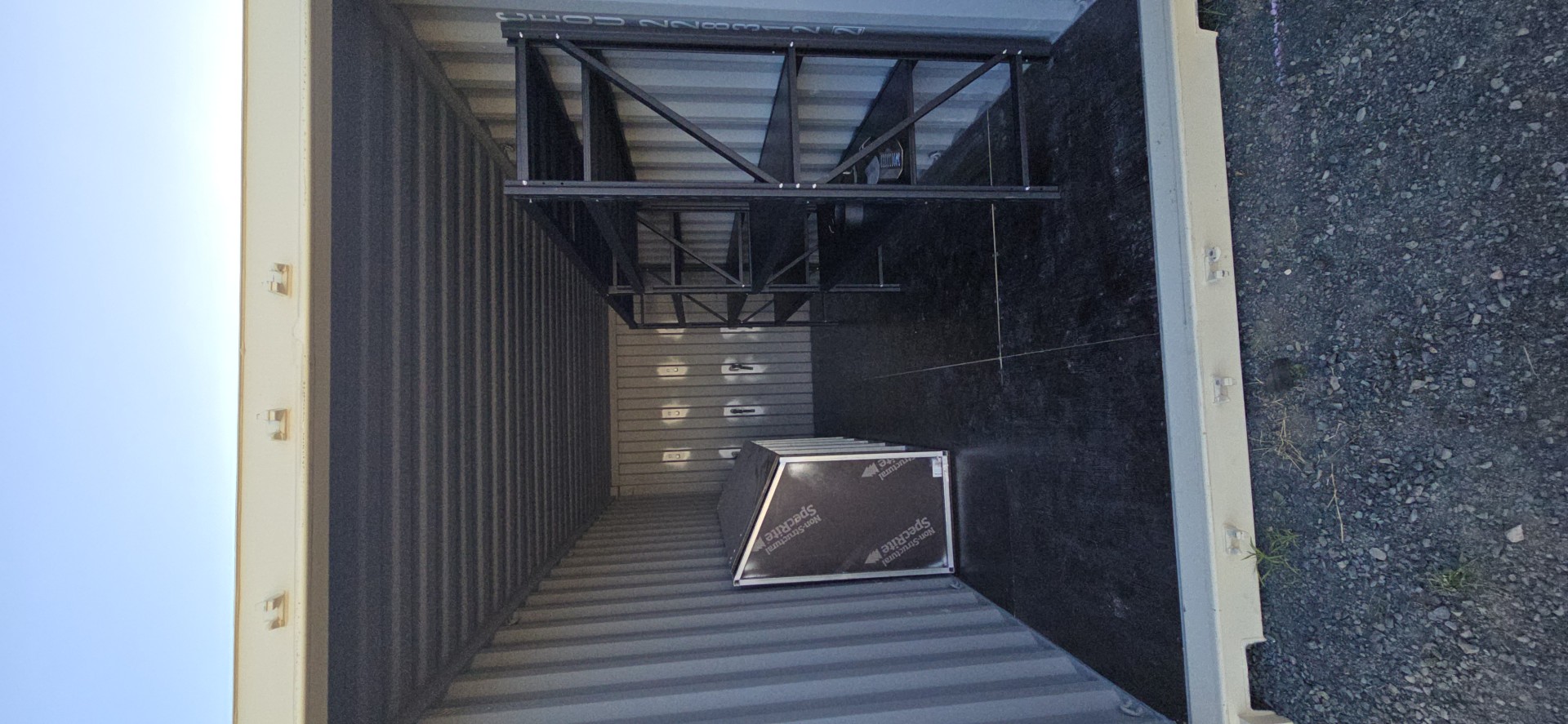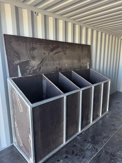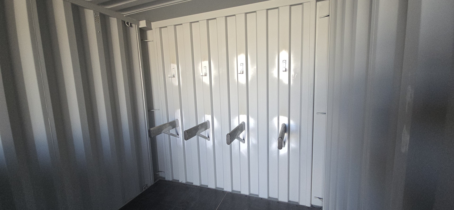 Sealed and vented tack room housed in a new 20ft container fitted with feed bins, shelving, and saddle racks.