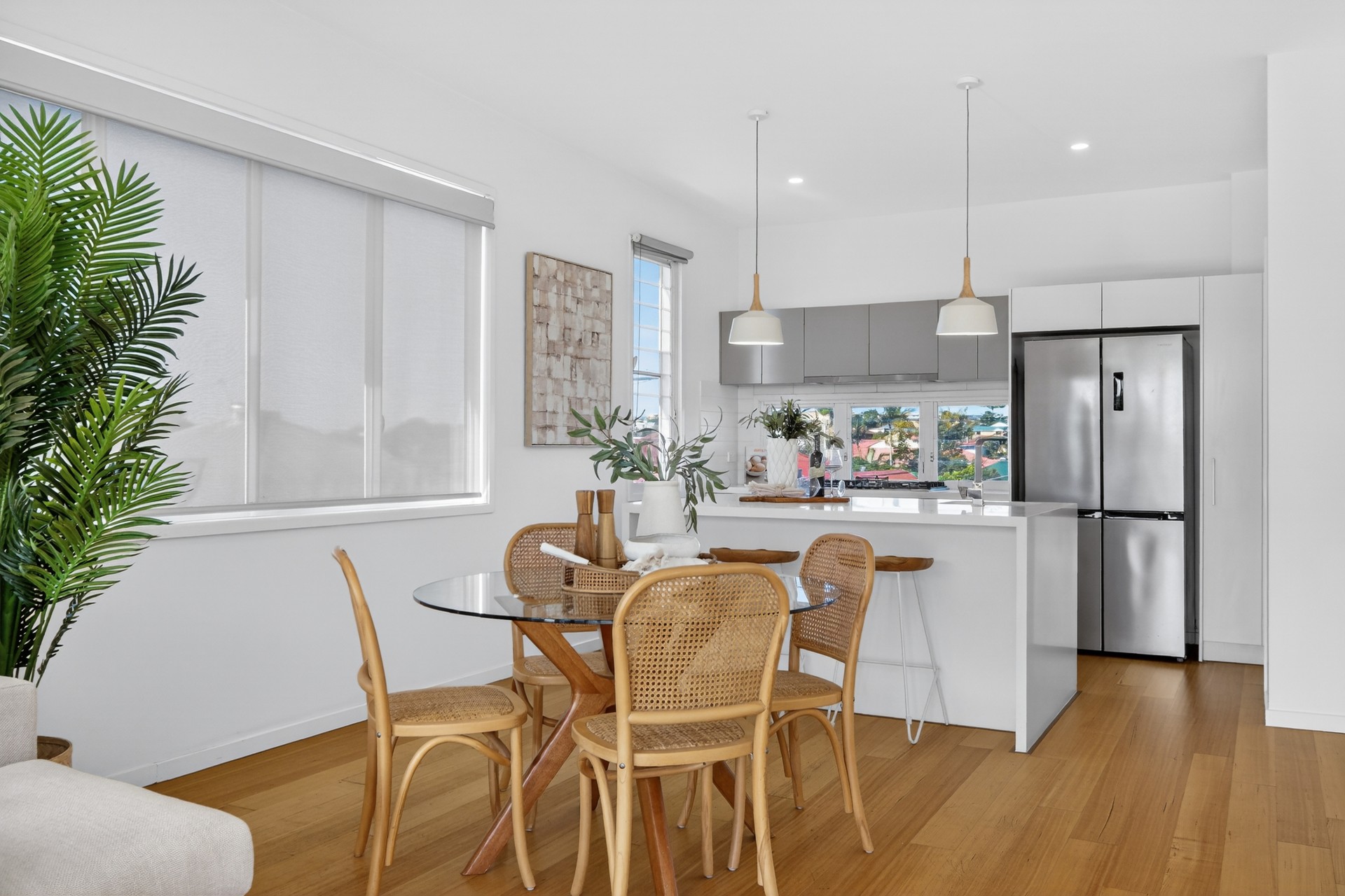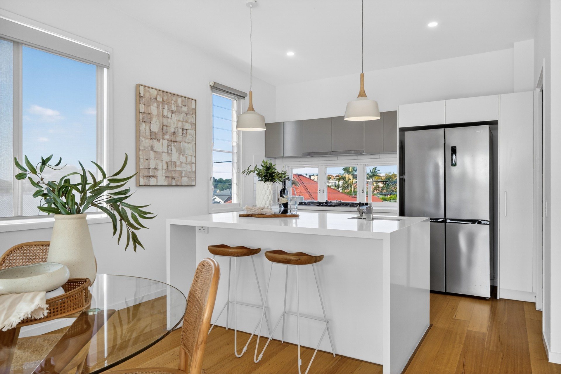Step inside and discover a thoughtfully designed layout that unfolds across multiple levels, offering both privacy and flow. Rather than being immediately greeted by the living space on entry, the home reveals its true showpiece upstairs - an expansive third-floor living and kitchen zone that captures a beautiful outlook and abundant natural light. Elevated above street level, this light-filled space, complemented by elegant oak timber floors, creates a sense of calm, making it perfect for both relaxed everyday living and stylish entertaining.