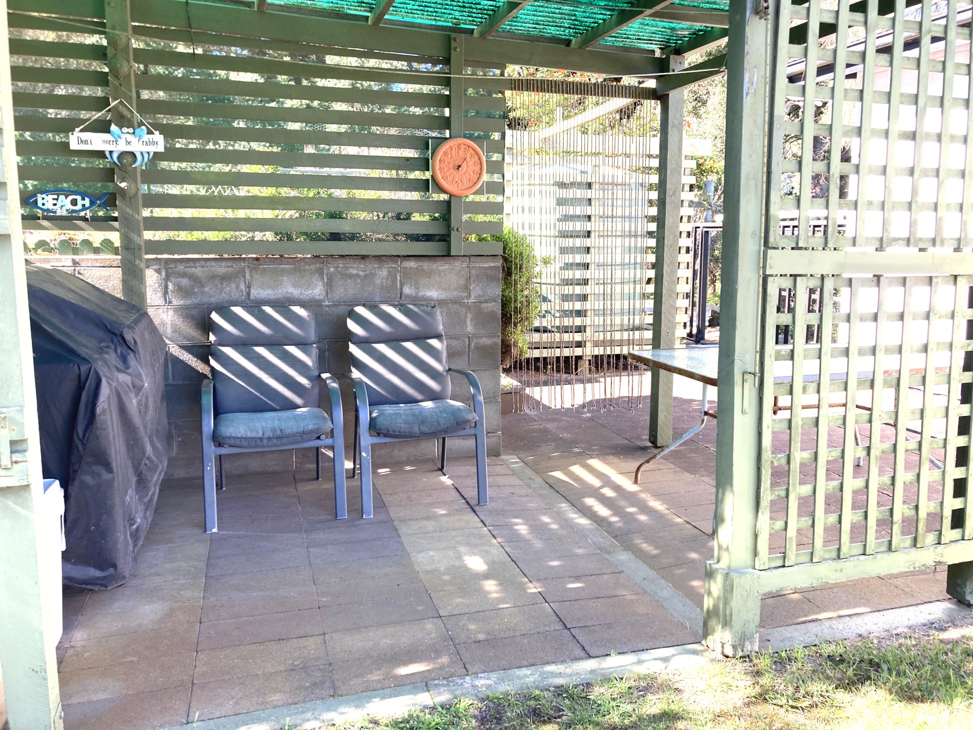 Porch leading into back yard with covered sitting/dining and BBQ area, surrounded by neat lawns and gardens.
