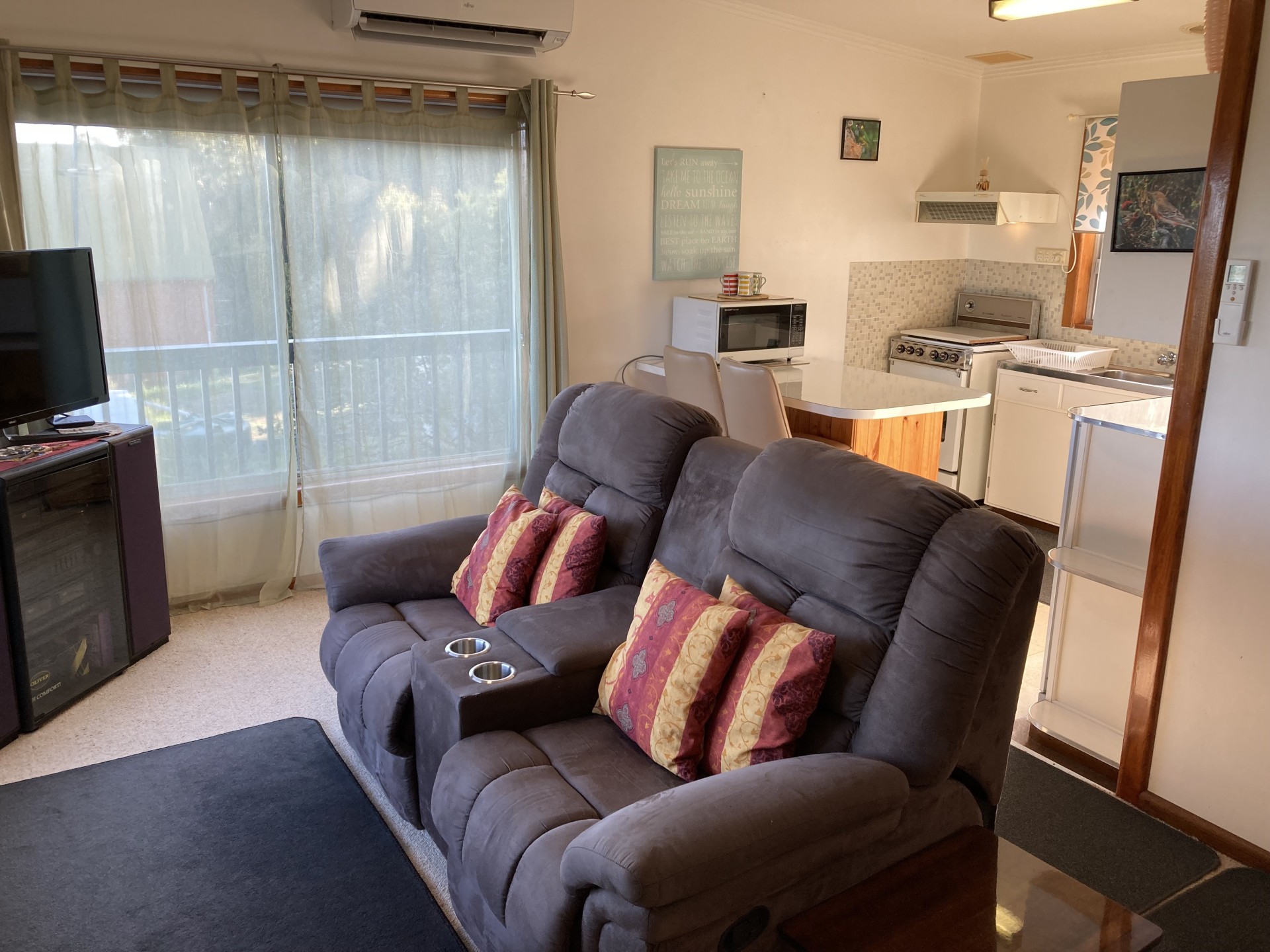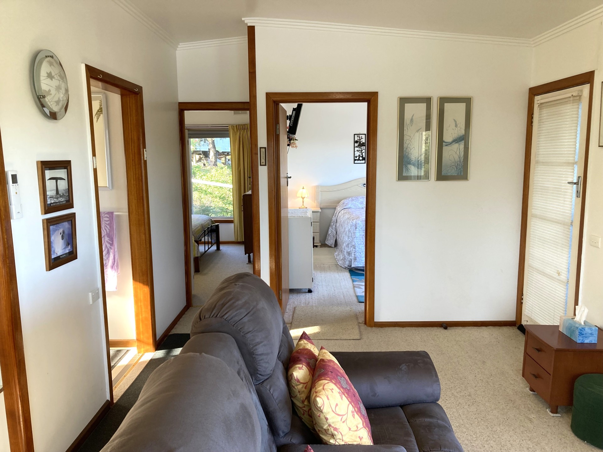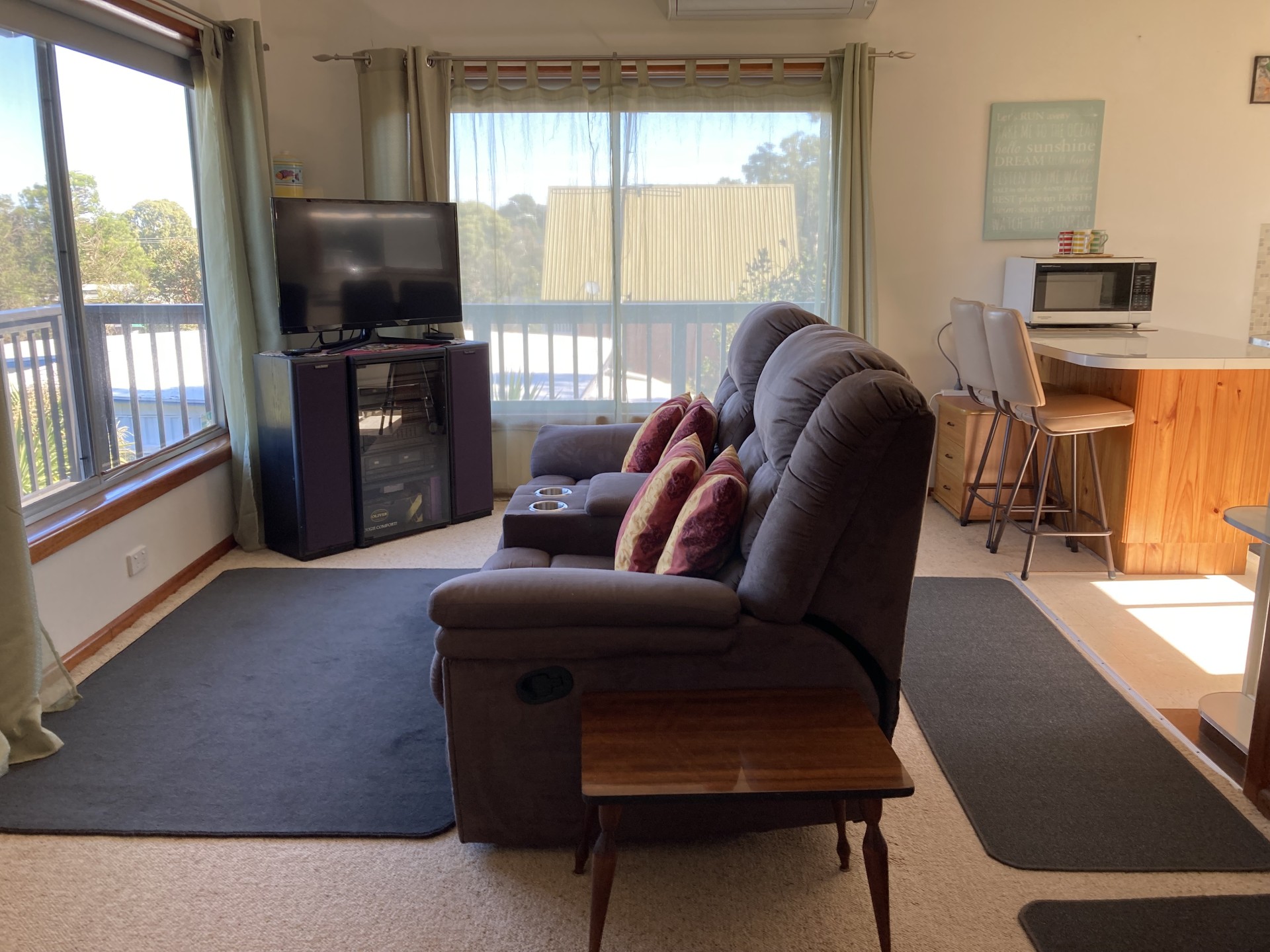 Comfortable living/lounge area with panoramic views over Lake Reeve, leading onto a fully restored Eco Deck Balcony.