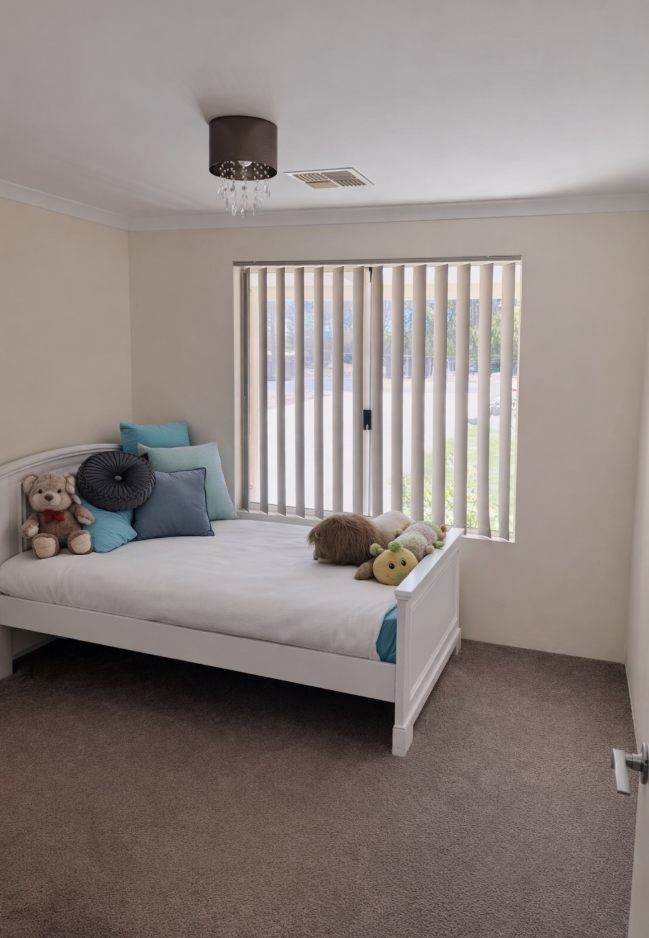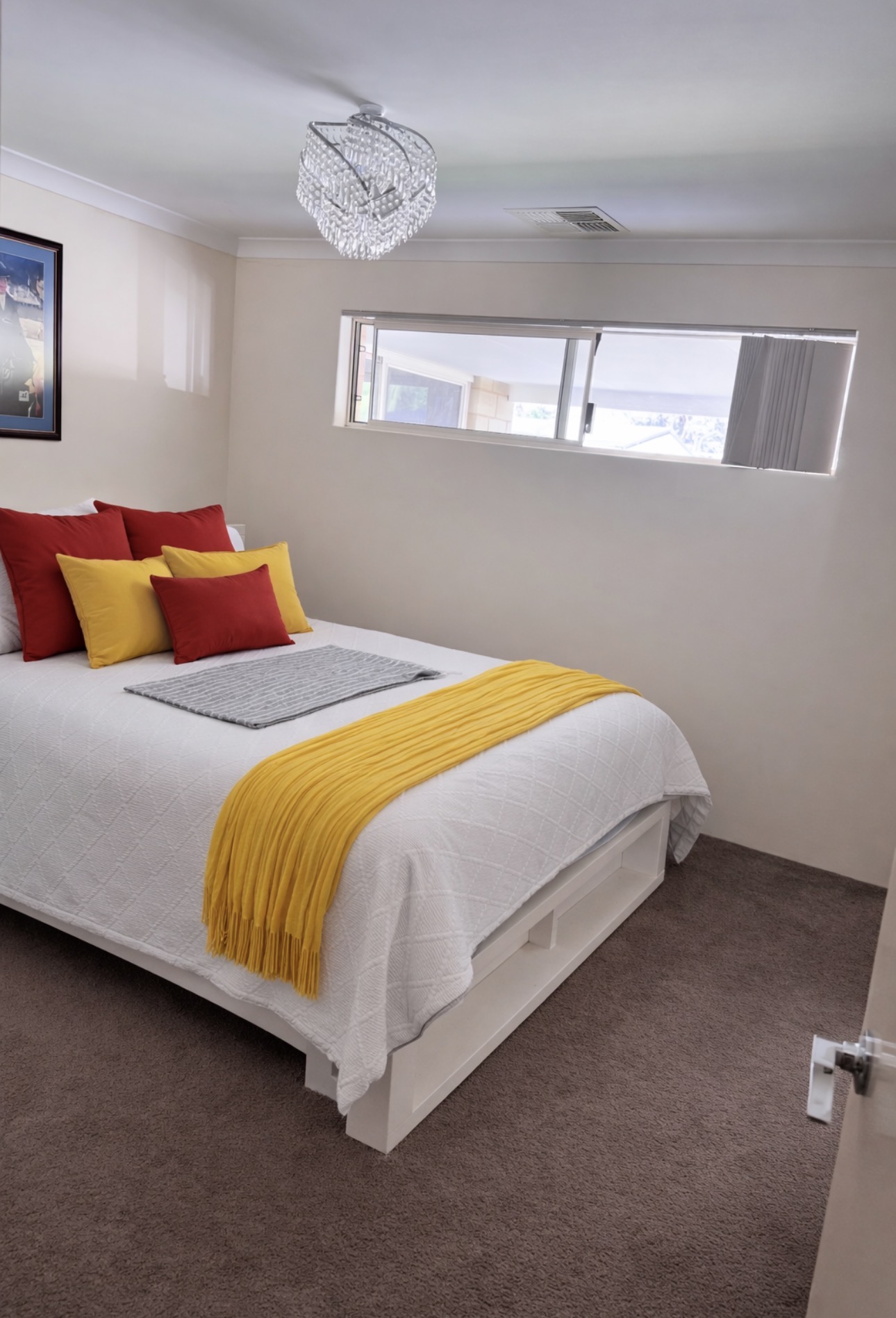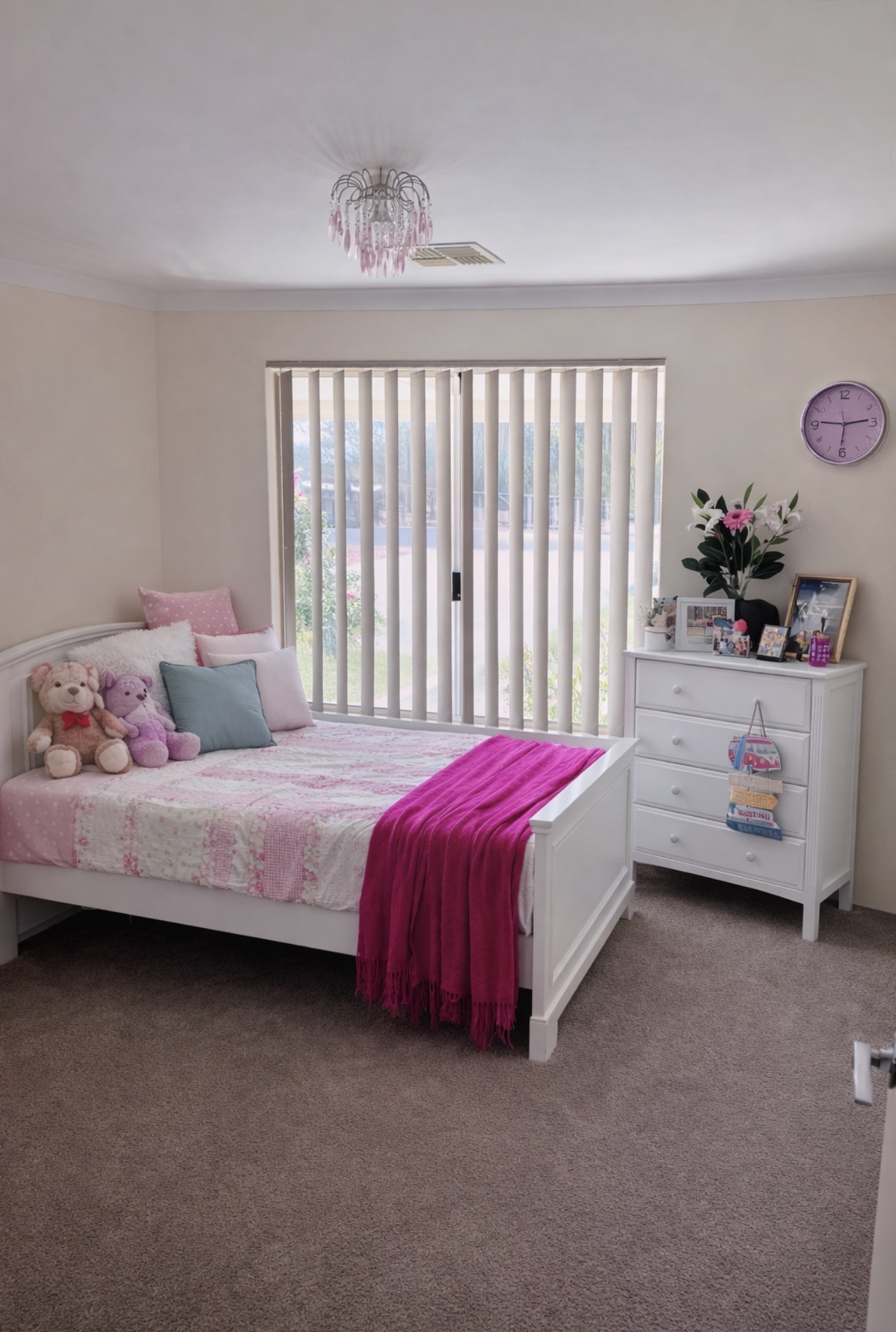 The master suite is privately positioned and well-appointed, complemented by additional bedrooms with built-in storage, ensuring comfort and convenience for the whole family.