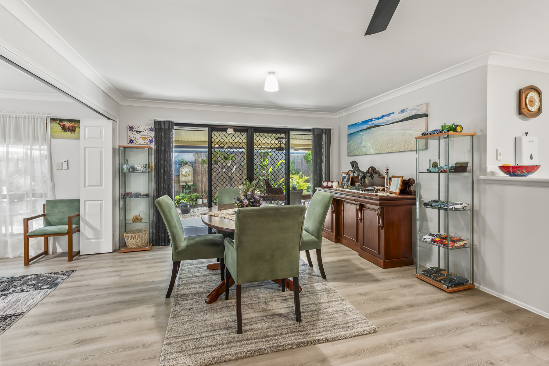 Embrace the outdoors in style with large double doors leading from the dining area to the expansive alfresco space, ideal for hosting gatherings or simply unwinding in the fresh air. Adjacent is a shaded plant area, perfect for those with a green thumb.