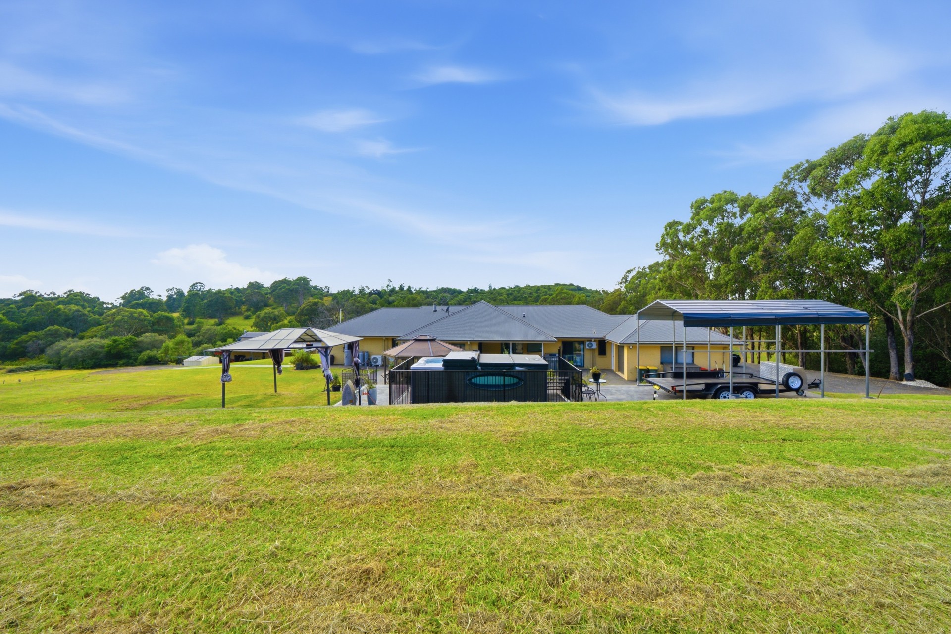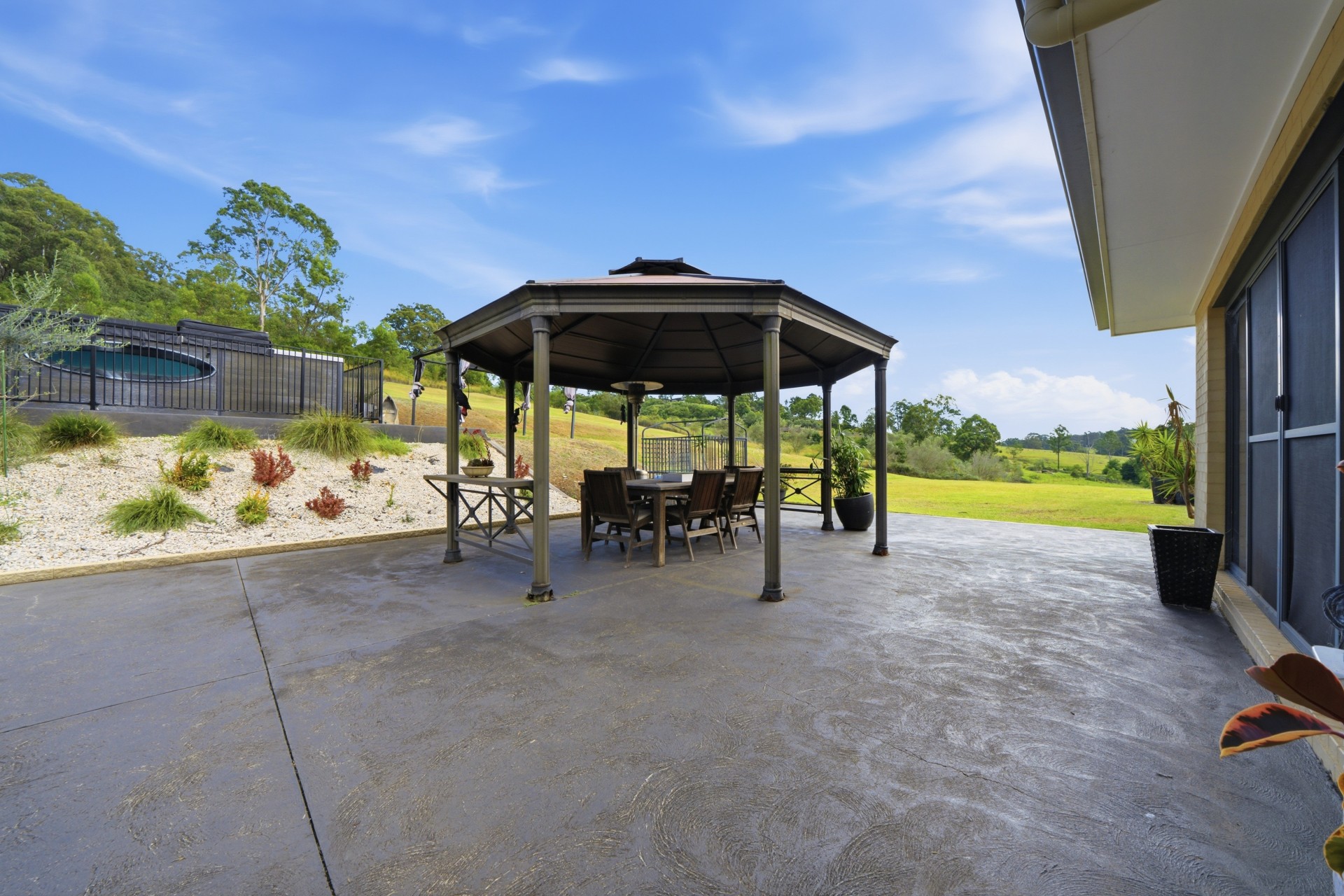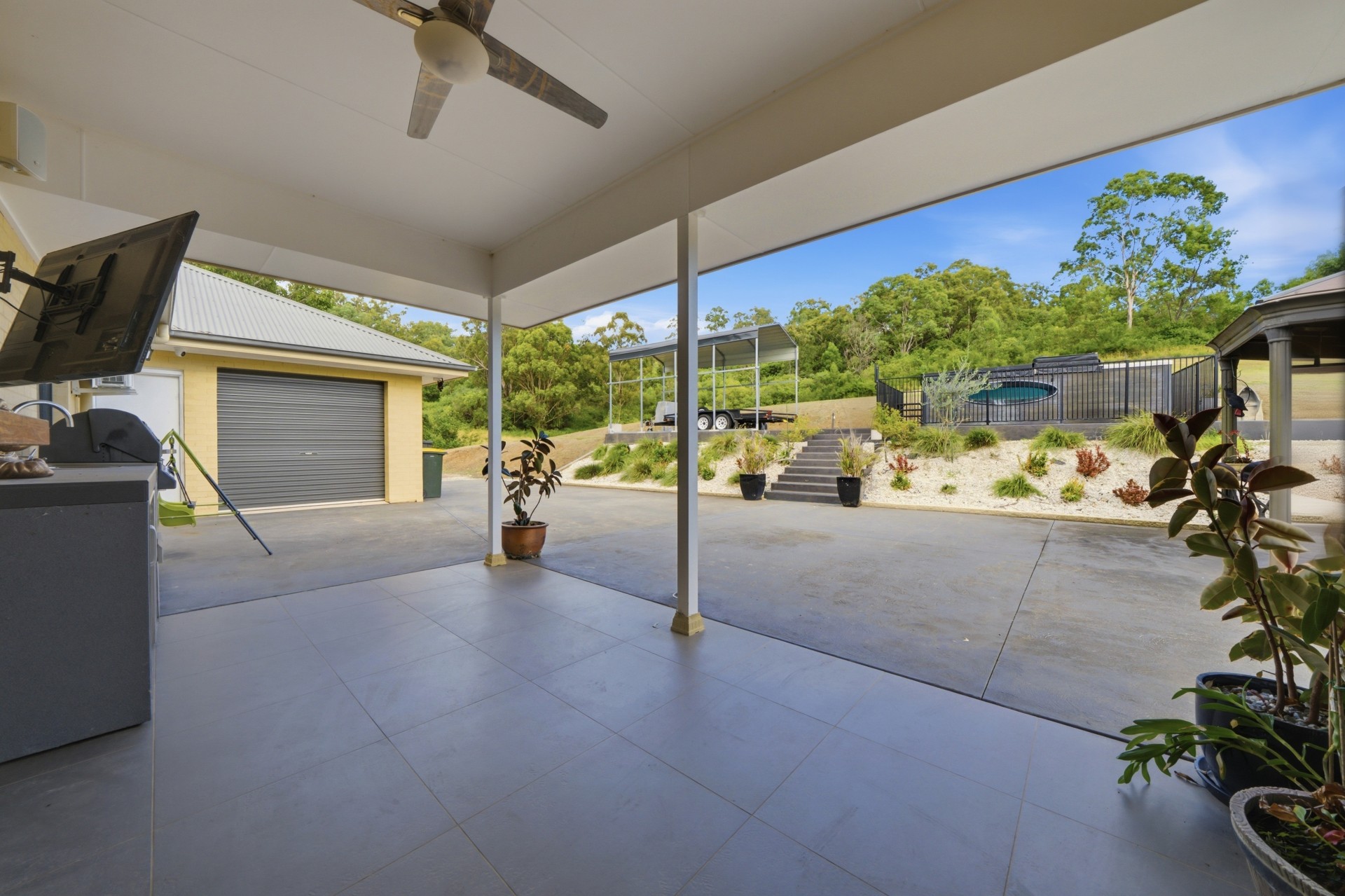 Large outdoor entertainment area with BBQ fully fenced swim spa and undercover alfresco area.