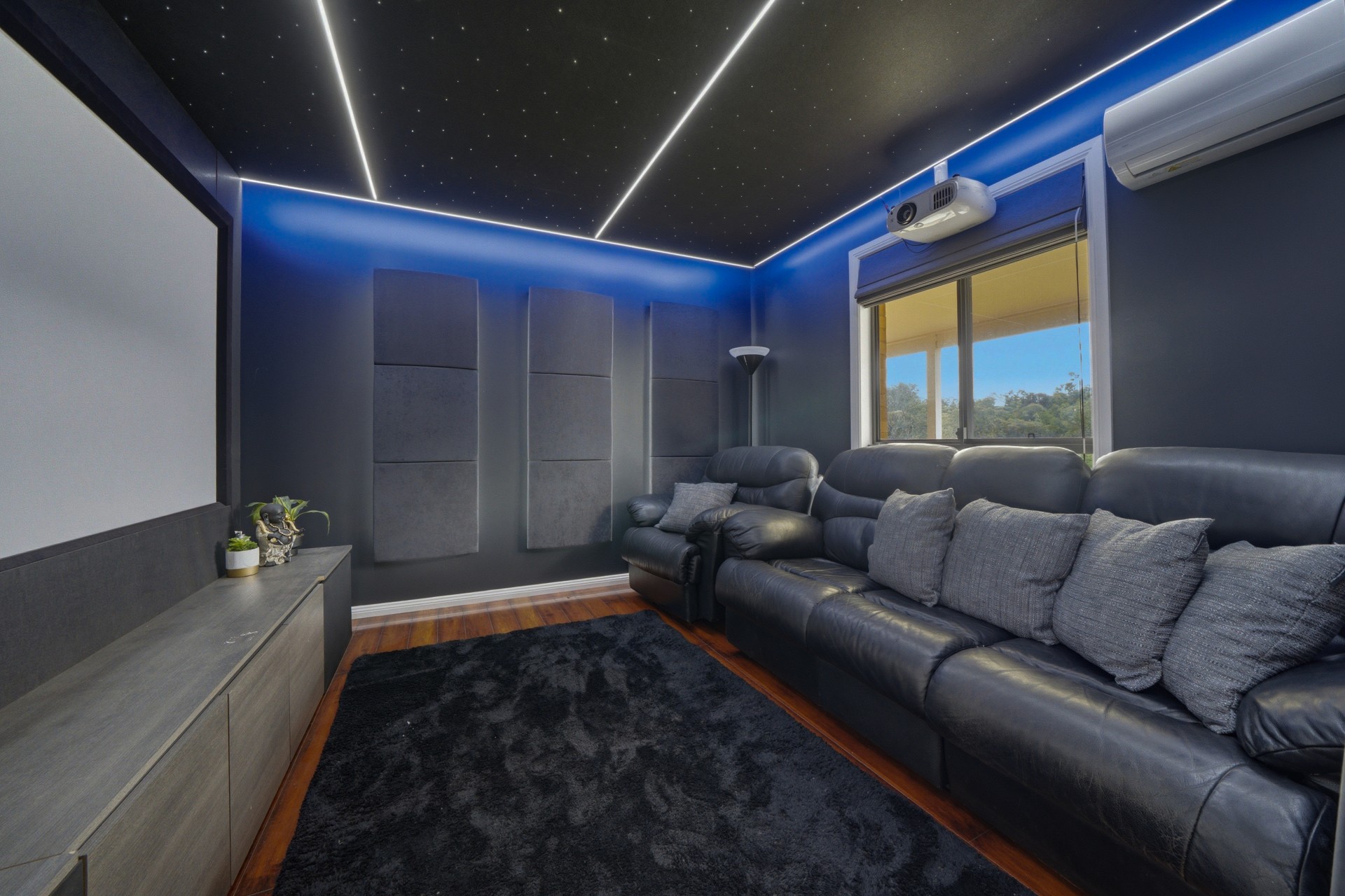 Cinema room with 100inch screen and projecta, sound system, amazing light display and electric black curtain to blackout curtains.