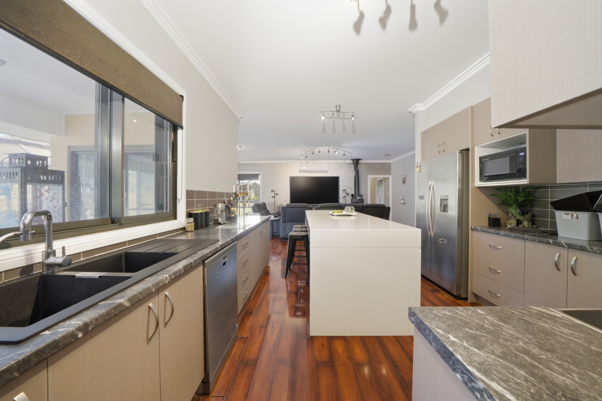 Large open area kitchen with dishwasher and a large upstairs area can be used as a 4th bedroom, has also split system reverse cycle A/C unit.
