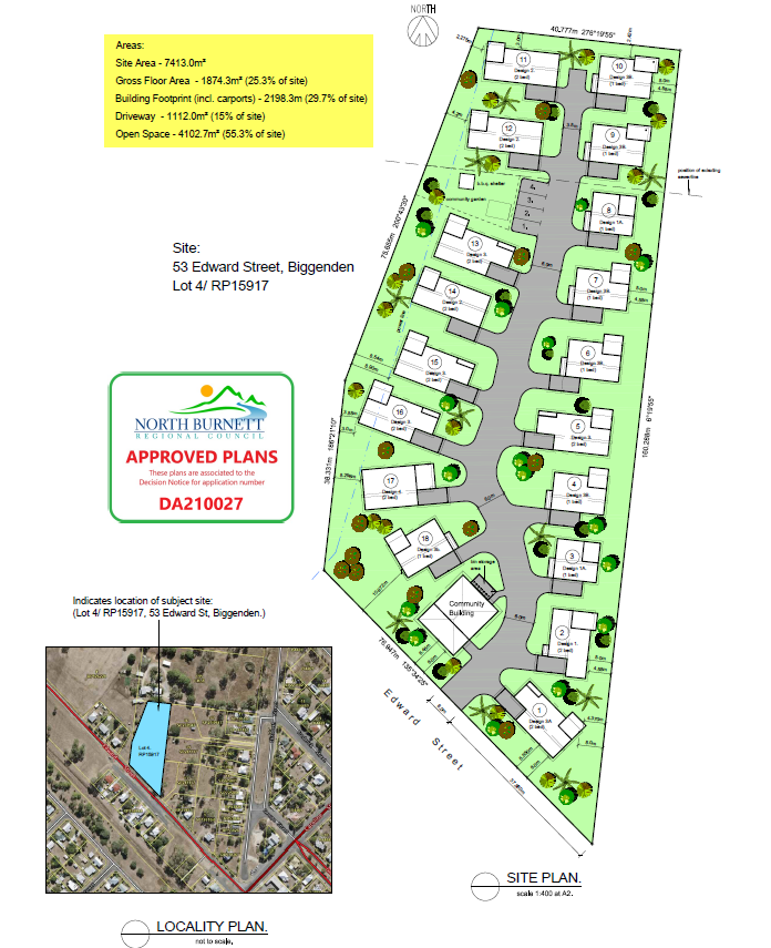 This 7,413sqm flat to gently sloping and flood free property has town planning approval for an eighteen (18) dwelling retirement living development that expires in November 2027 (unless extended). The approved site layout plan and a contour and detail plan are attached.