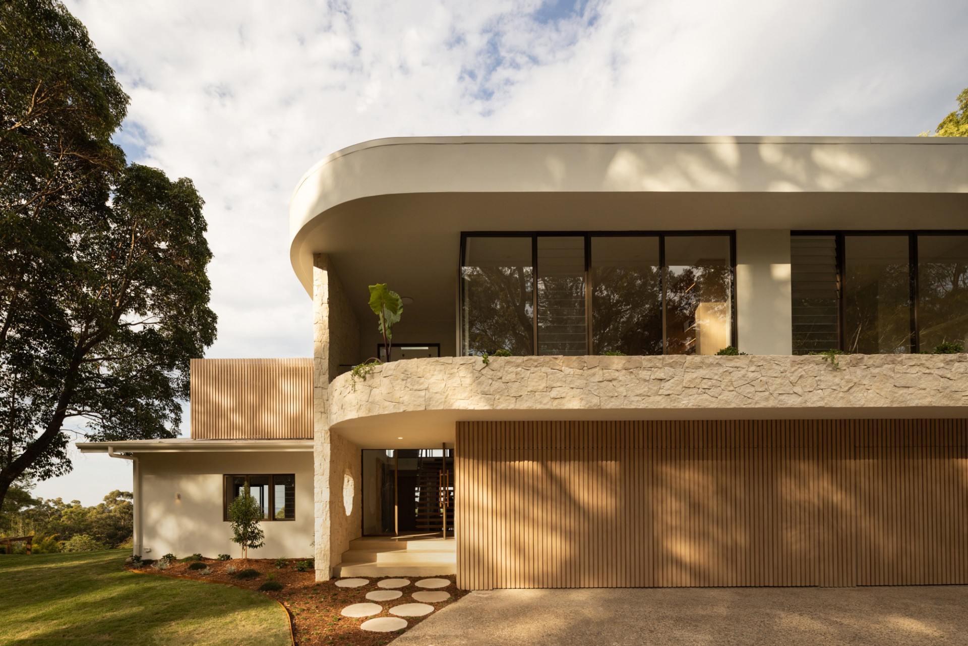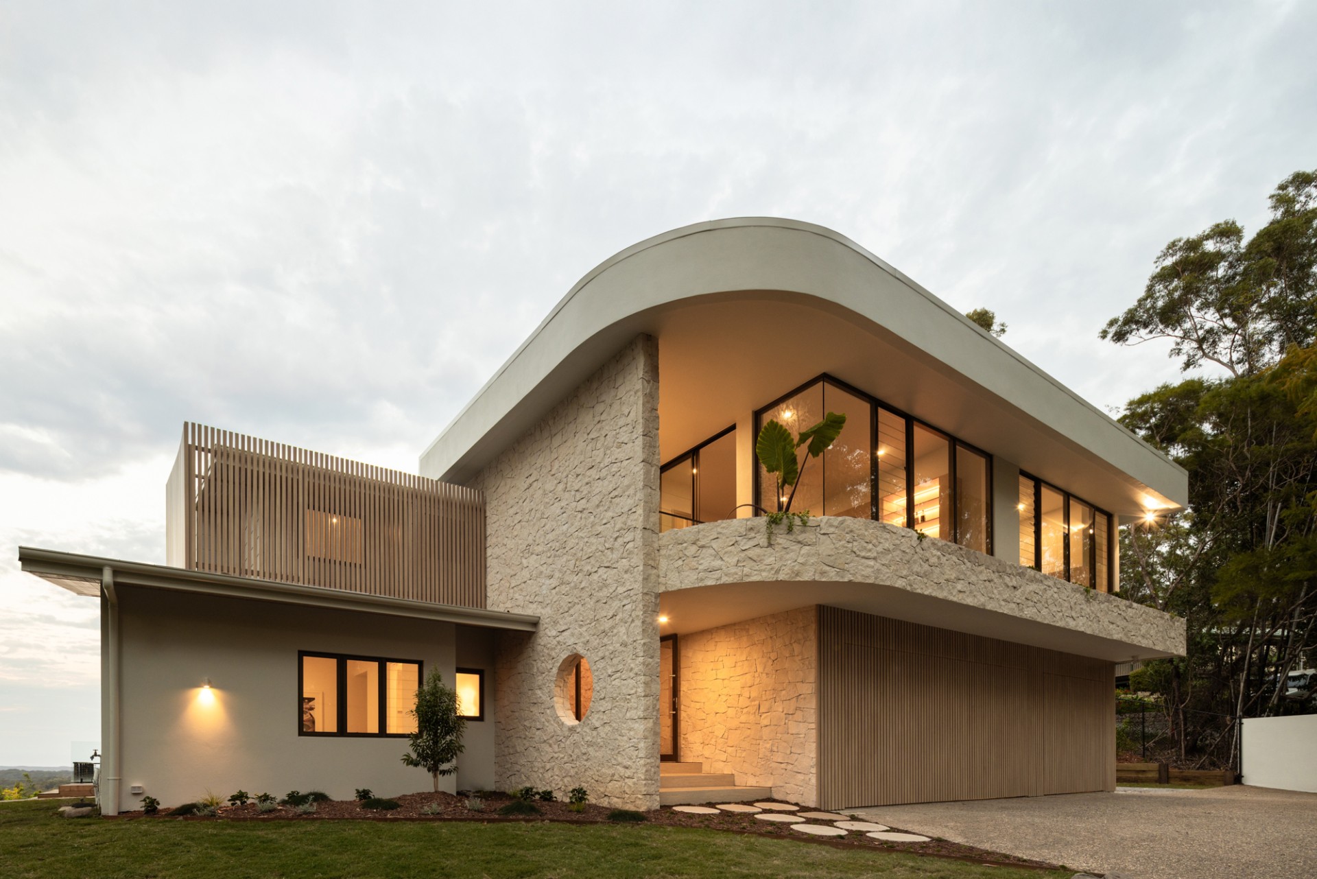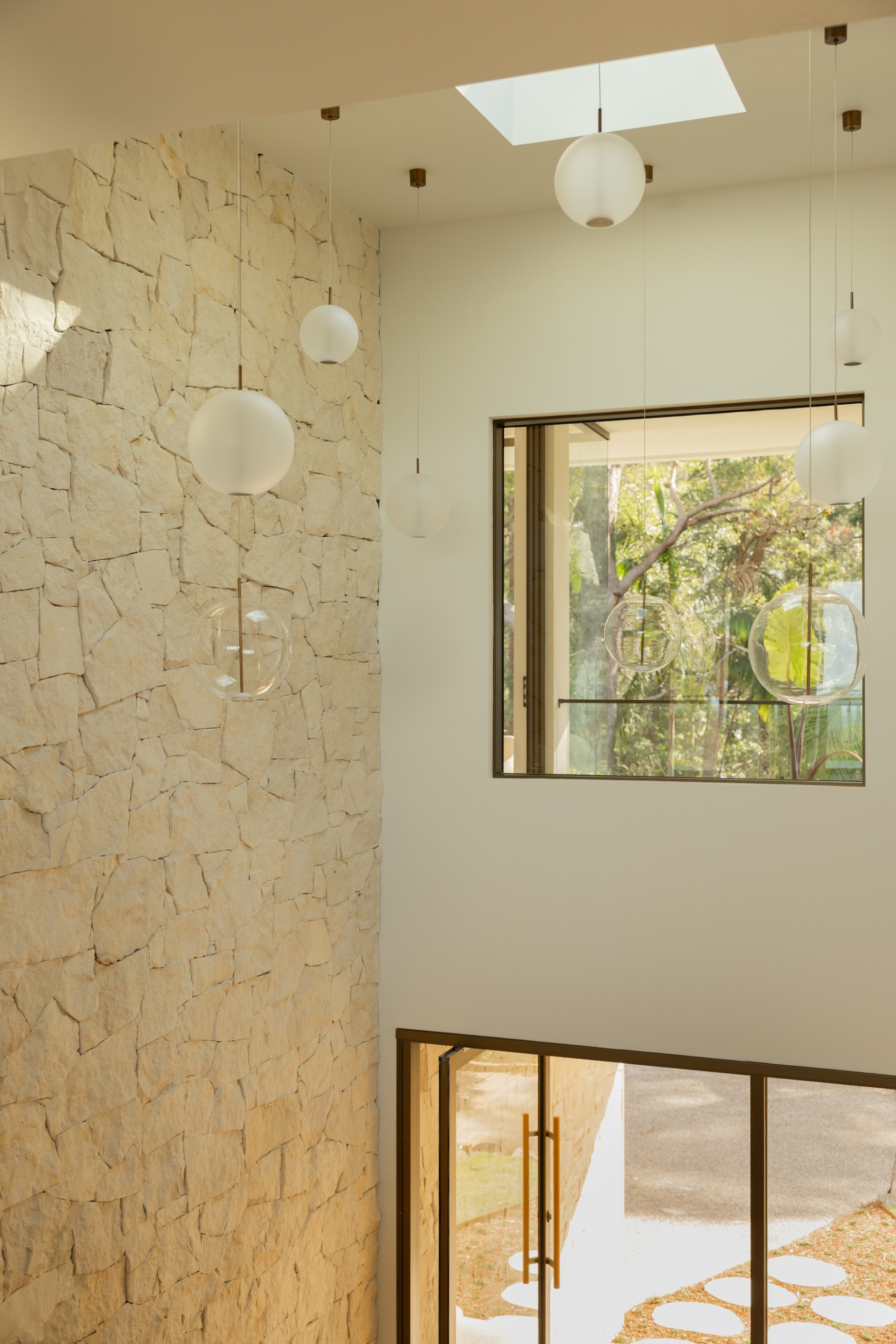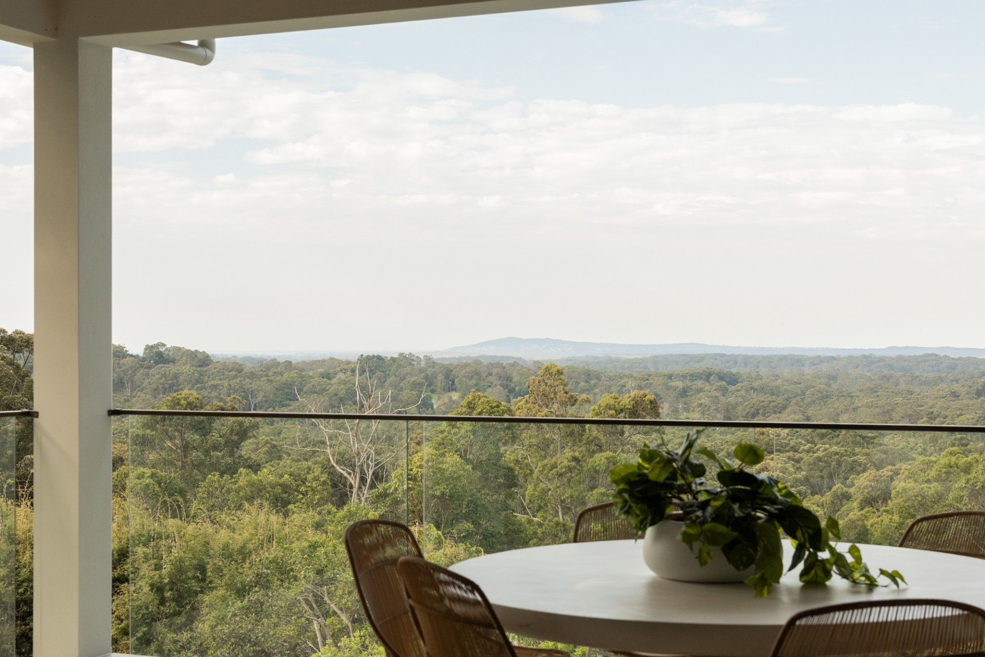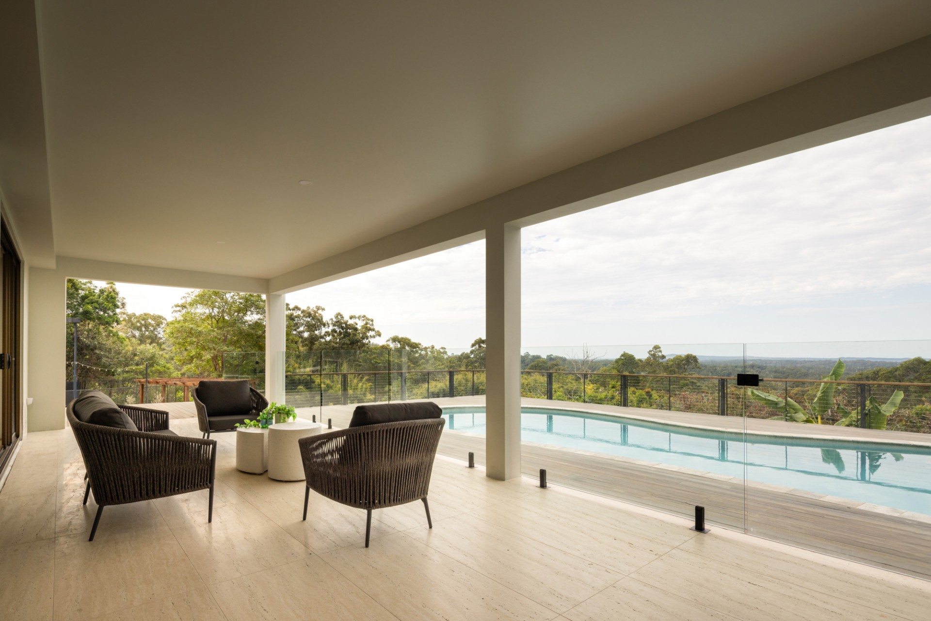 Natural materials including travertine, sandstone, and oak define the architecture. Floor-to-ceiling windows frame the Noosa Hinterland canopy, while indoor-outdoor spaces flow seamlessly across manicured lawns, native gardens, and outdoor pavilions. Every detail reflects a commitment to elegance, comfort, and connection with the Queensland landscape.