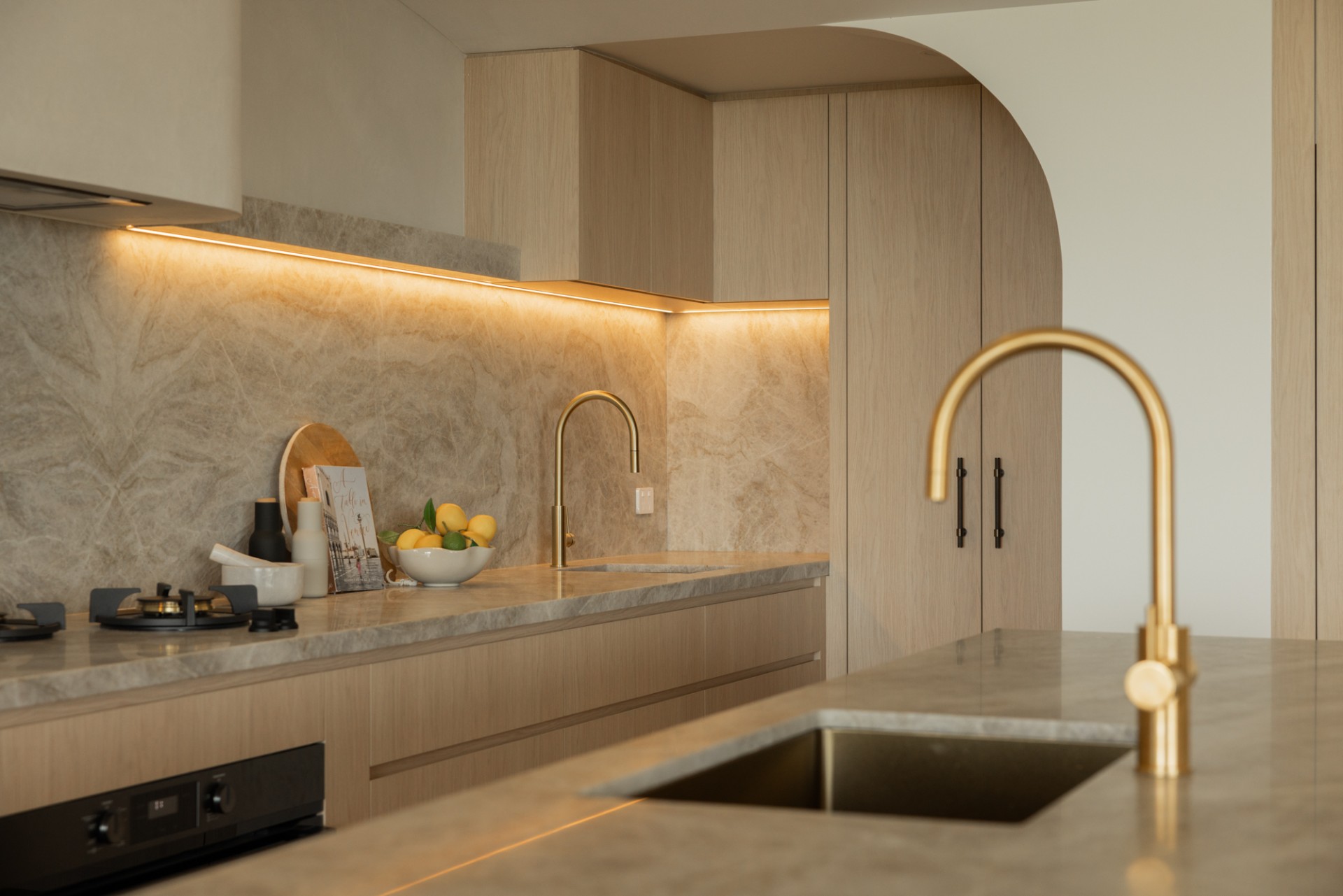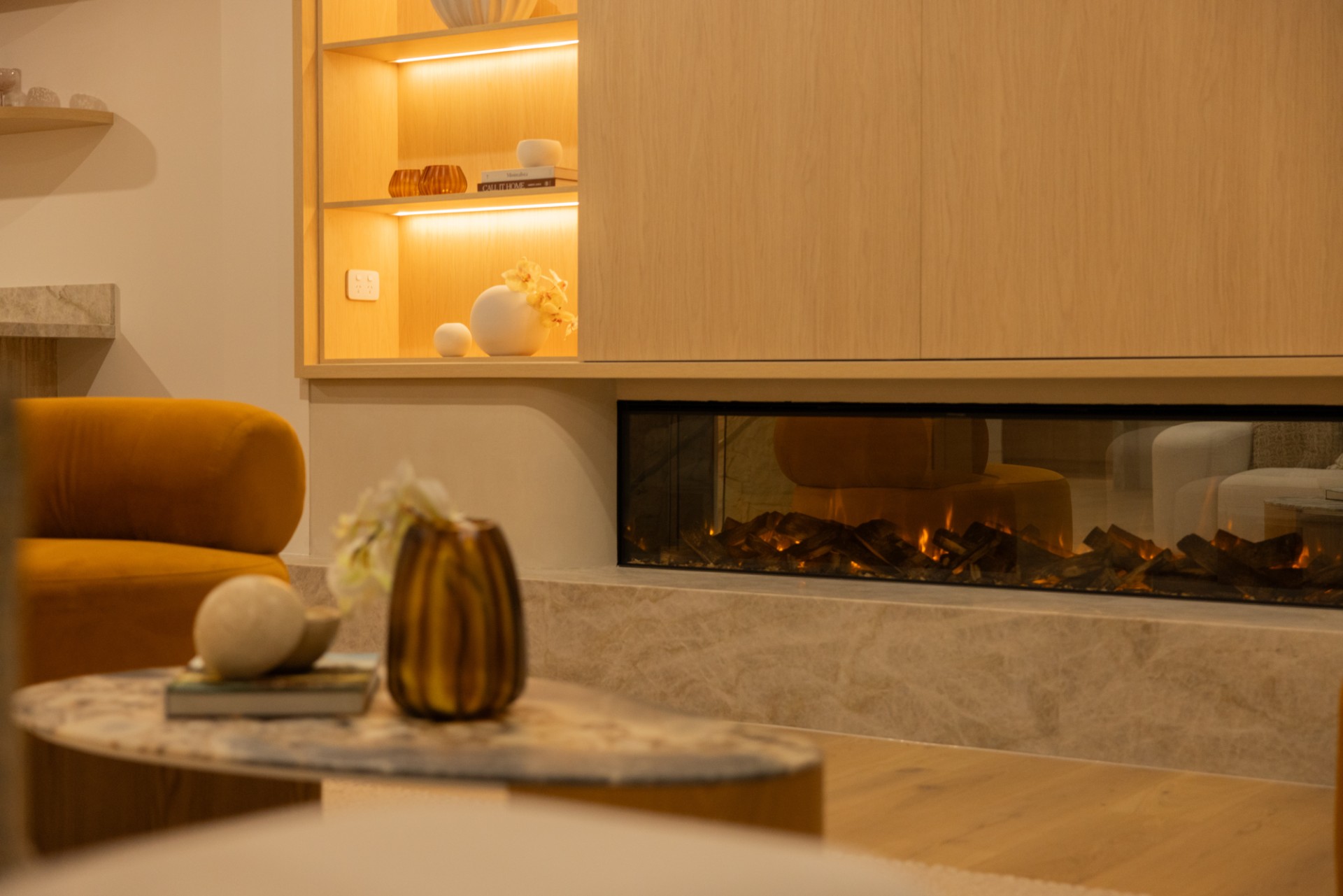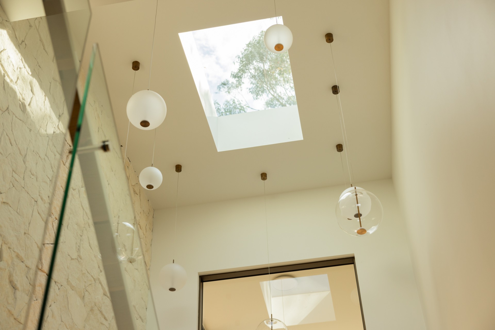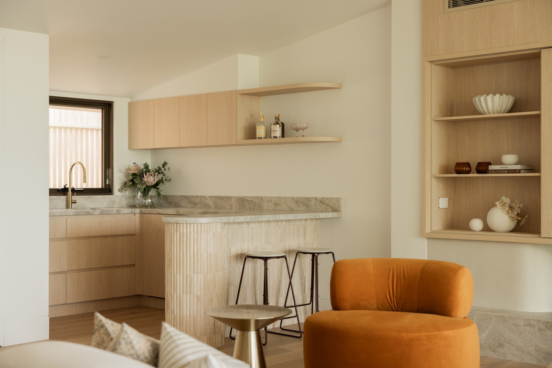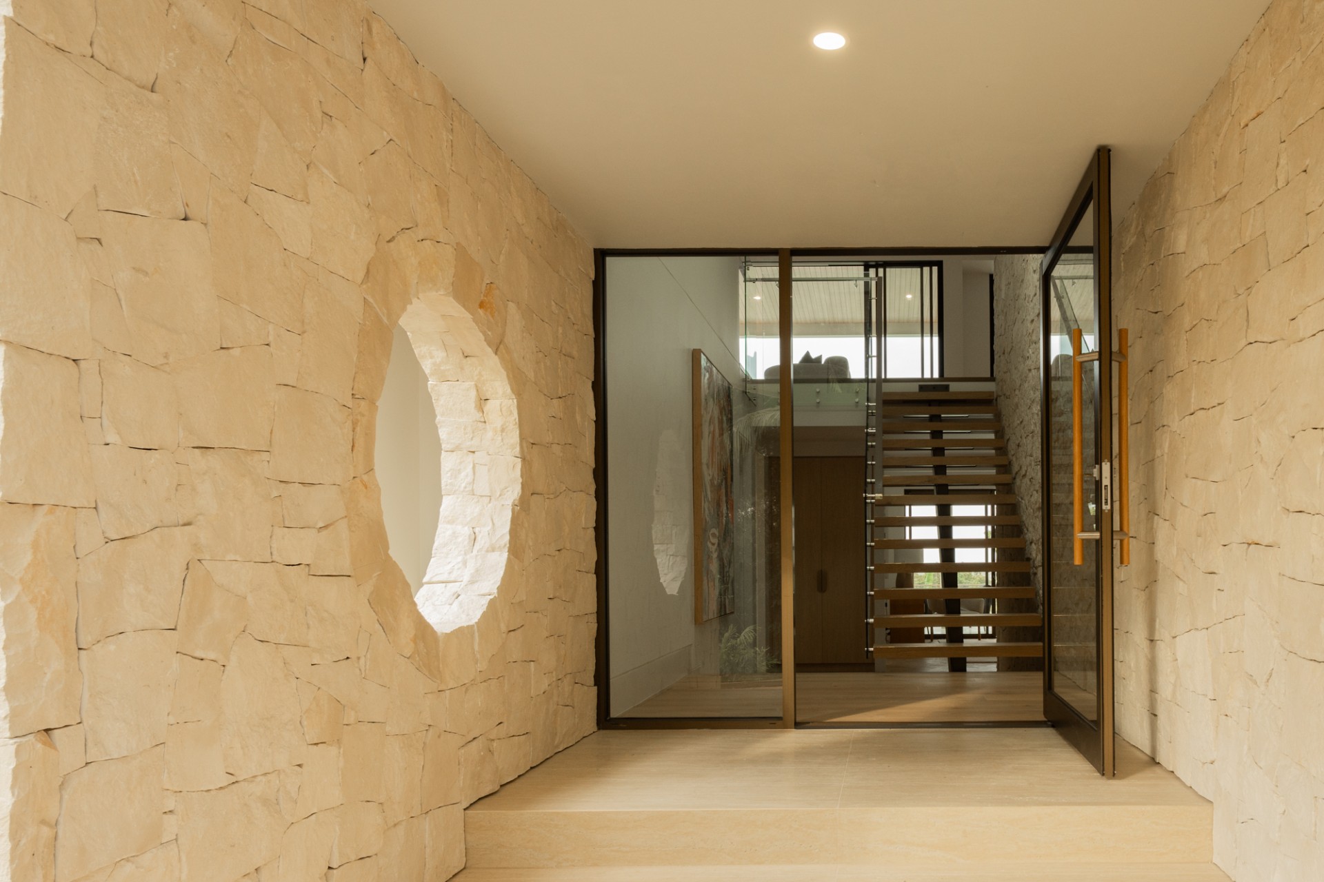 Natural materials including travertine, sandstone, and oak define the architecture. Floor-to-ceiling windows frame the Noosa Hinterland canopy, while indoor-outdoor spaces flow seamlessly across manicured lawns, native gardens, and outdoor pavilions. Every detail reflects a commitment to elegance, comfort, and connection with the Queensland landscape.