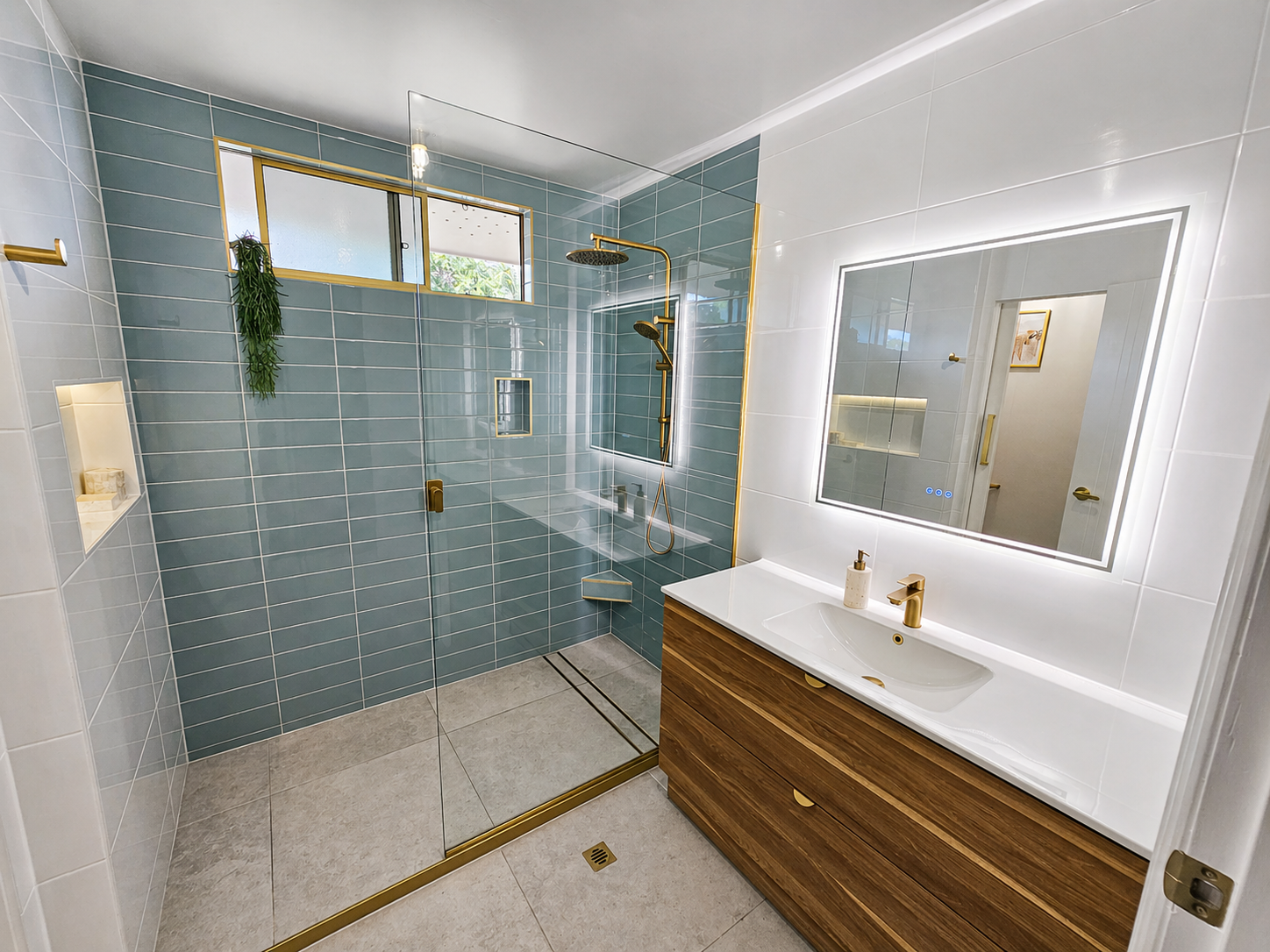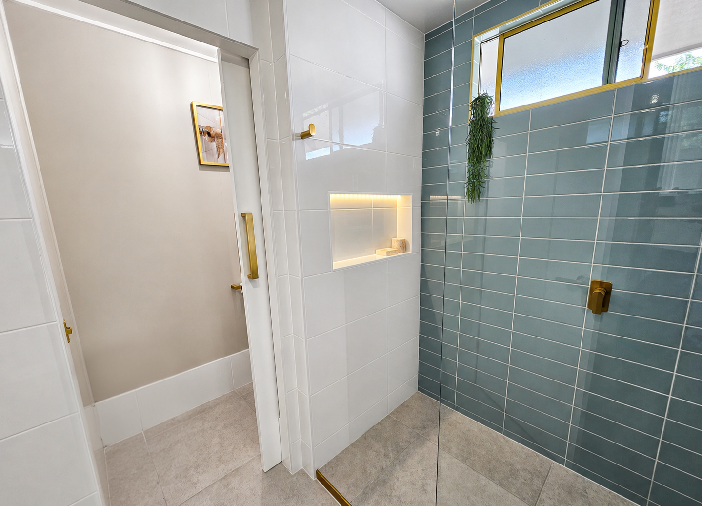 Upstairs feels fresh, functional, and inviting, with three well-sized bedrooms. The beautifully renovated bathroom is a standout feature, showcasing a walk-in shower with rainfall head, brushed brass and gold finishes, and a large tiled niche with integrated LED lighting - combining everyday practicality with a touch of luxury.