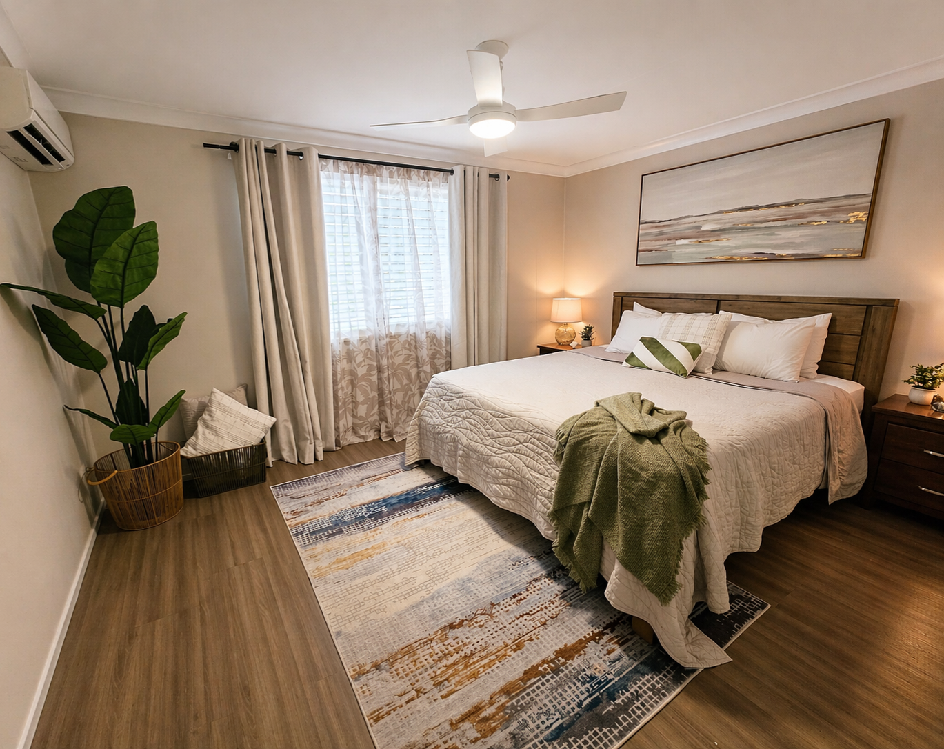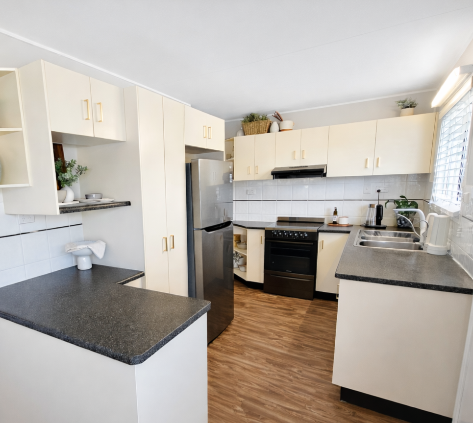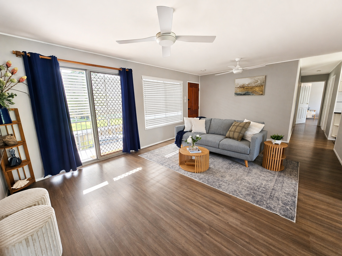 The kitchen is well-equipped for daily living, offering ample storage, a pantry, overhead cupboards, plus a new oven and rangehood. Air-conditioning in the main living area and two bedrooms, ceiling fans throughout, and insulation ensure year-round comfort.