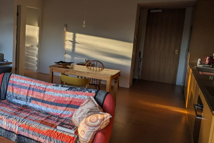 Step into a generous open-plan living area where natural light and cork tile flooring create a warm, contemporary feel. Double-glazed doors open onto your private balcony; designed with the living room floor and balcony deck perfectly flush, the transition is completely seamless, creating an effortless indoor-outdoor flow and an expansive sense of space. The kitchen is both refined and practical, with ample storage, a stainless steel benchtop, integrated dishwasher, and an induction cooktop-ideal for everyday living and entertaining.