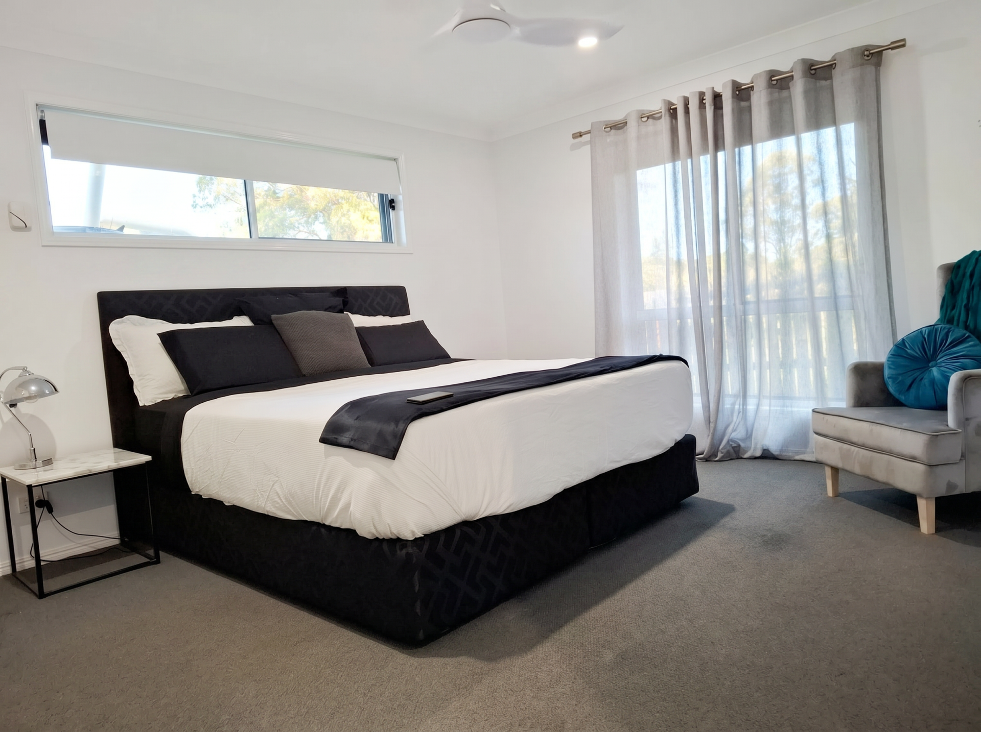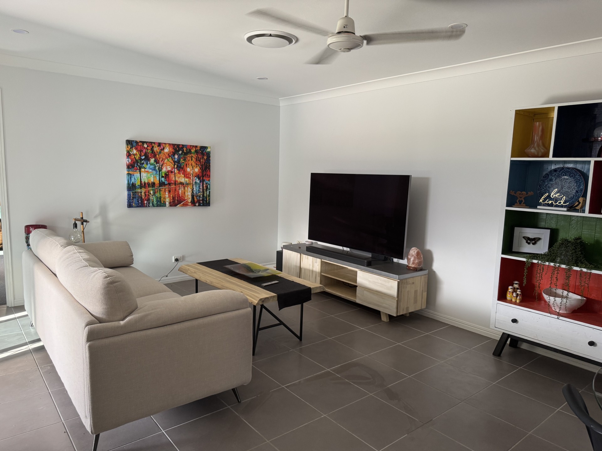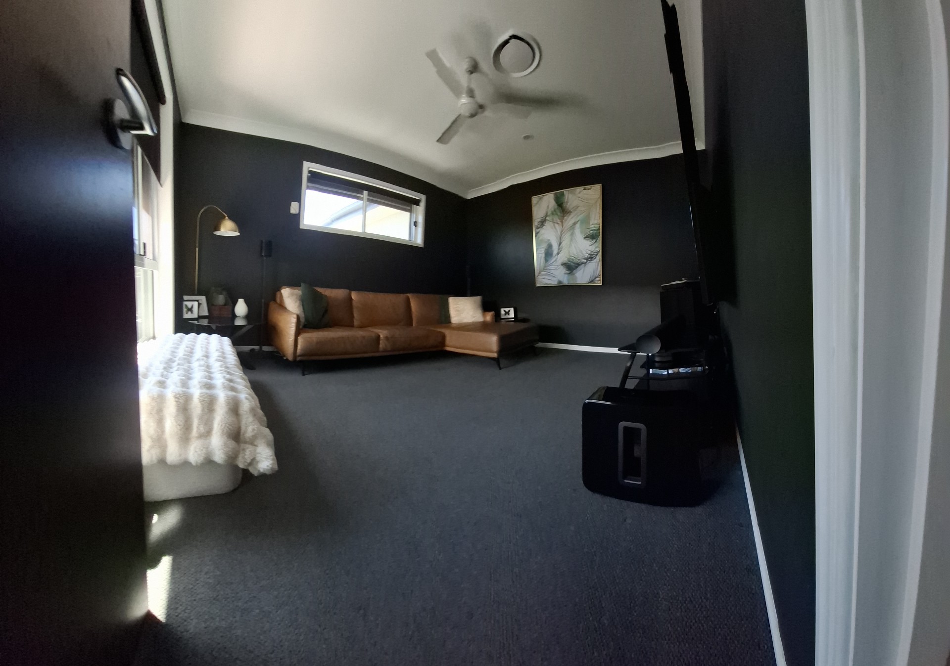 At the heart of the home, a large, modern kitchen and open-plan living area flows seamlessly into a sophisticated lounge that effortlessly doubles as a blacked-out media room, thanks to stylish window shutters.