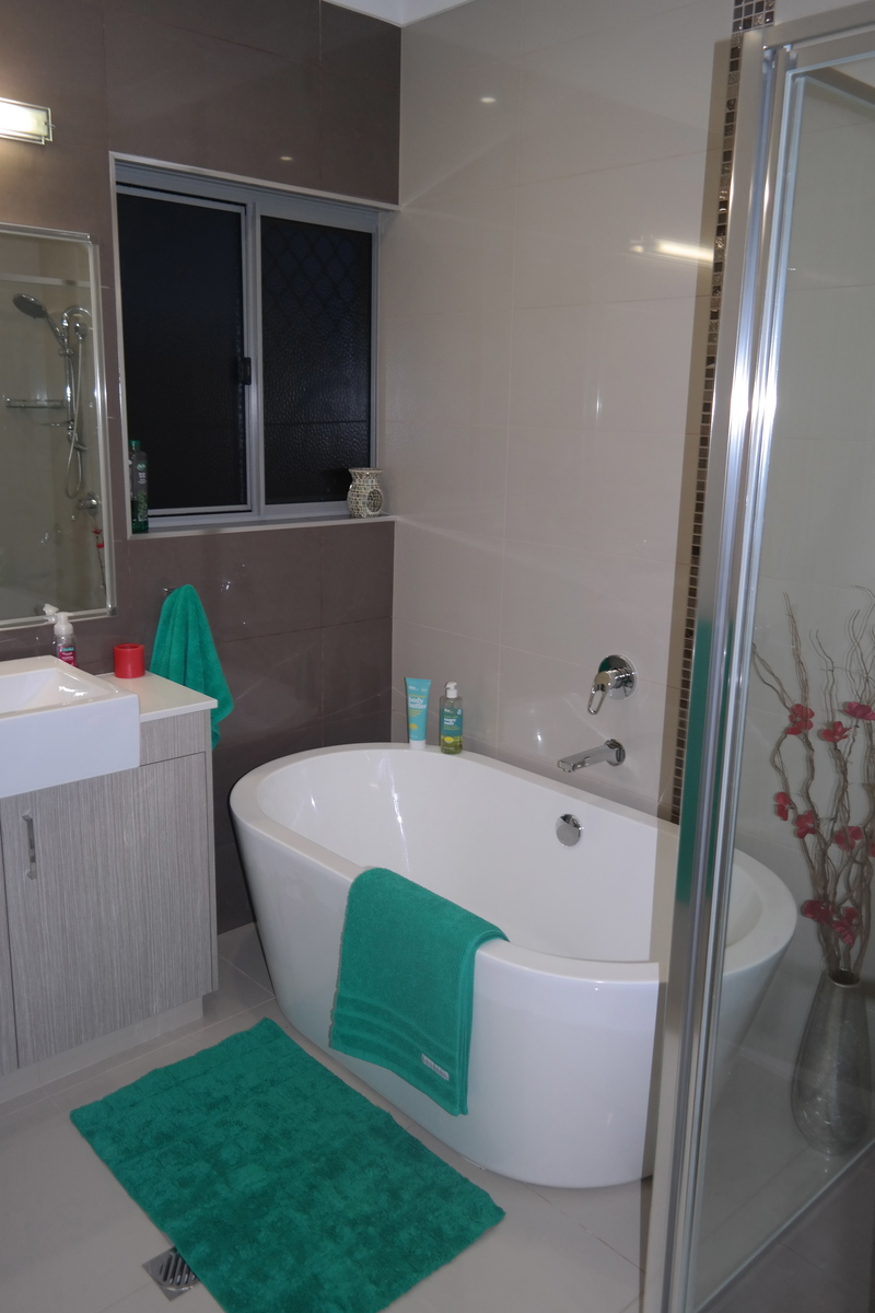Two luxurious bathrooms (main includes stand-alone bathtub) both with stone bench tops