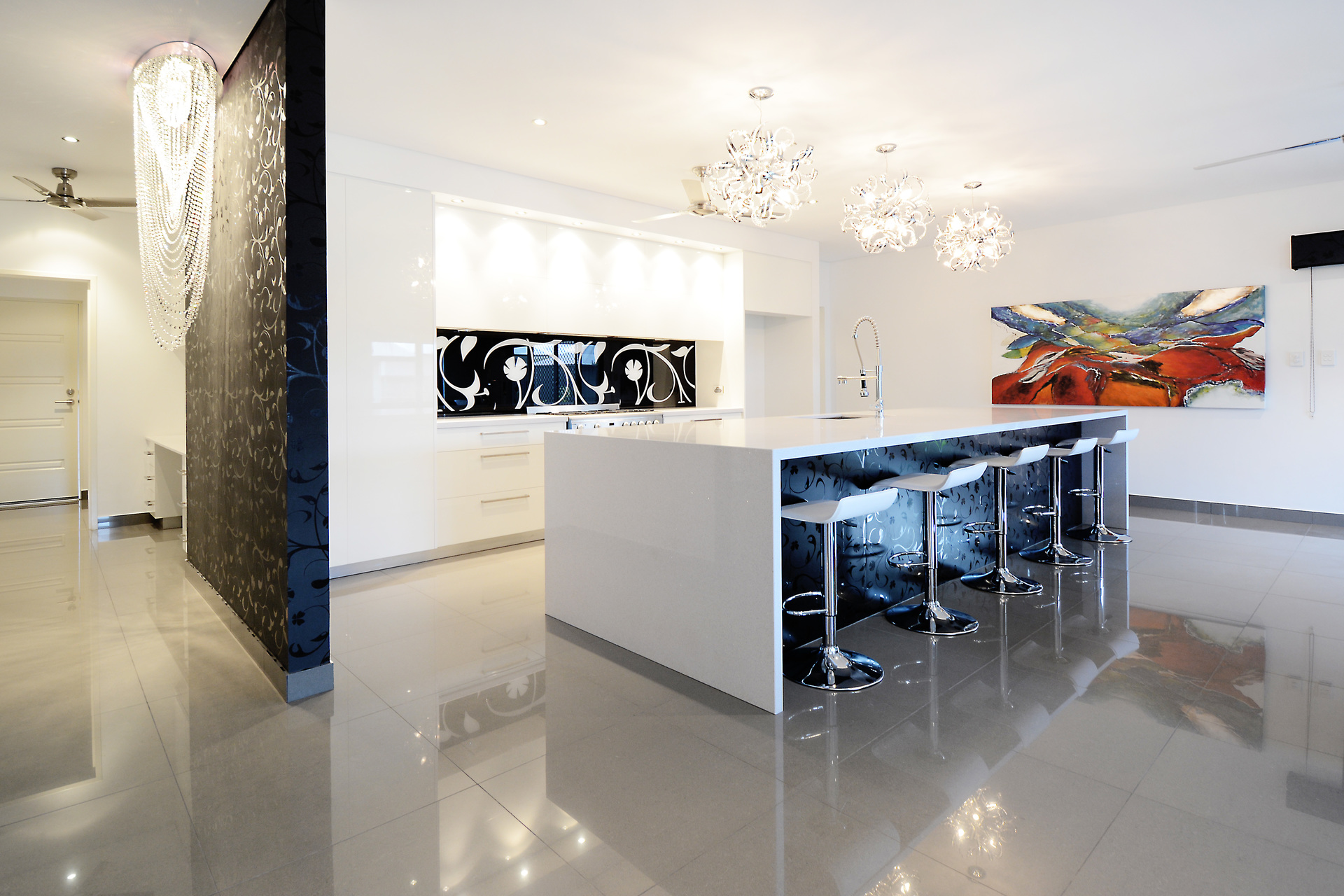 * Master Chef kitchen with a 4 meter island bench with waterfall ends & glass splash back