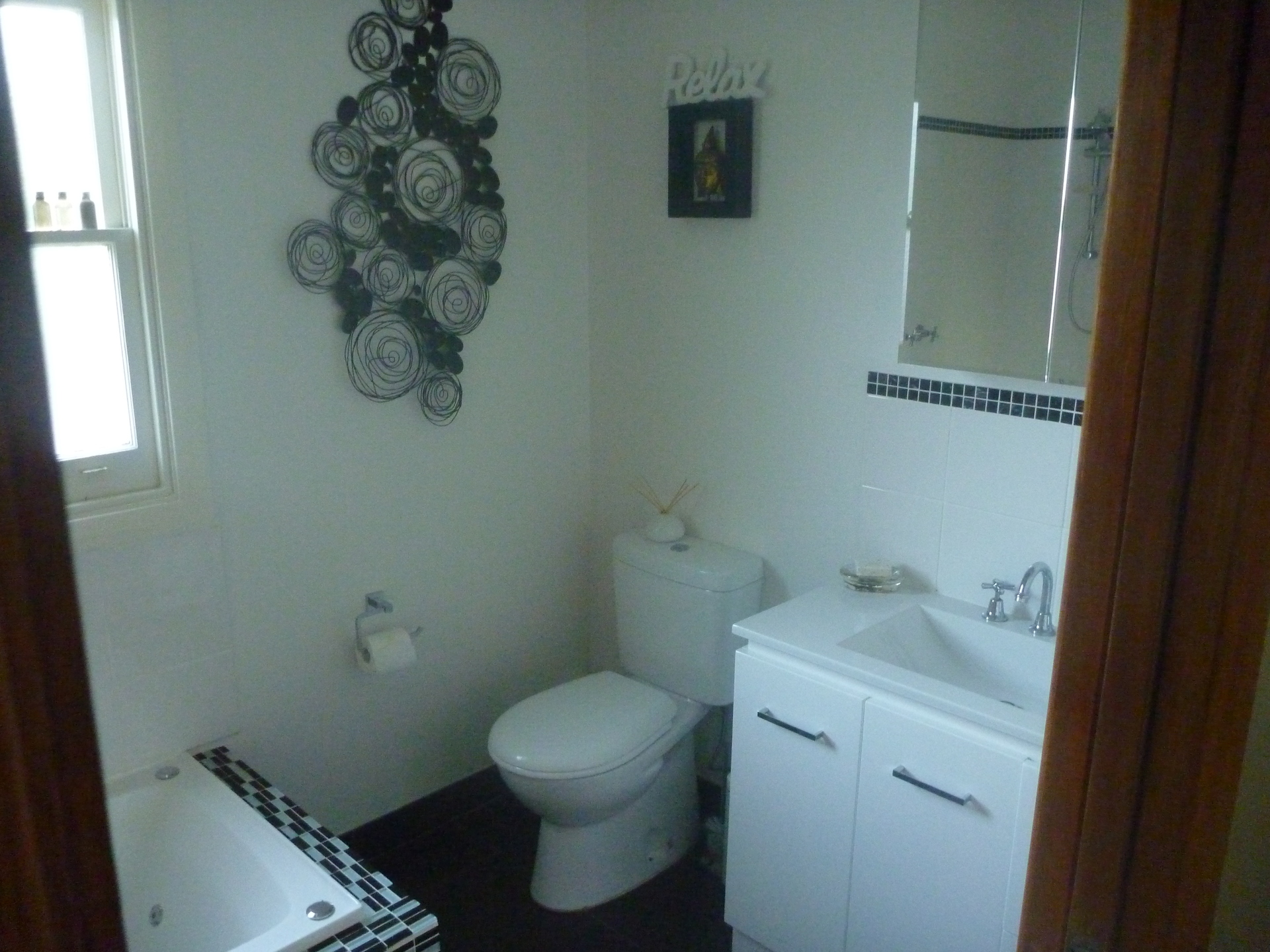 A large and modernized bathroom enjoys a large spa bath to soak away your cares.