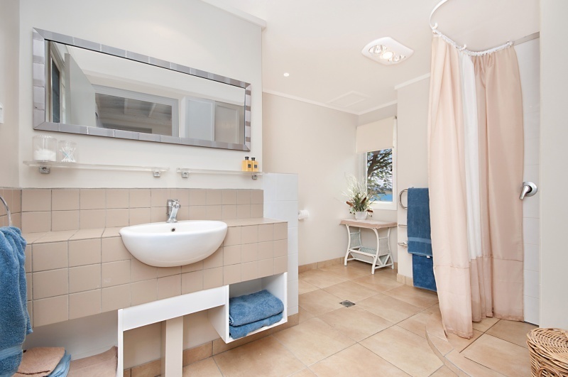 A lounge room with wide windows and doors open to lake side under deck , completes this fully tiled level .