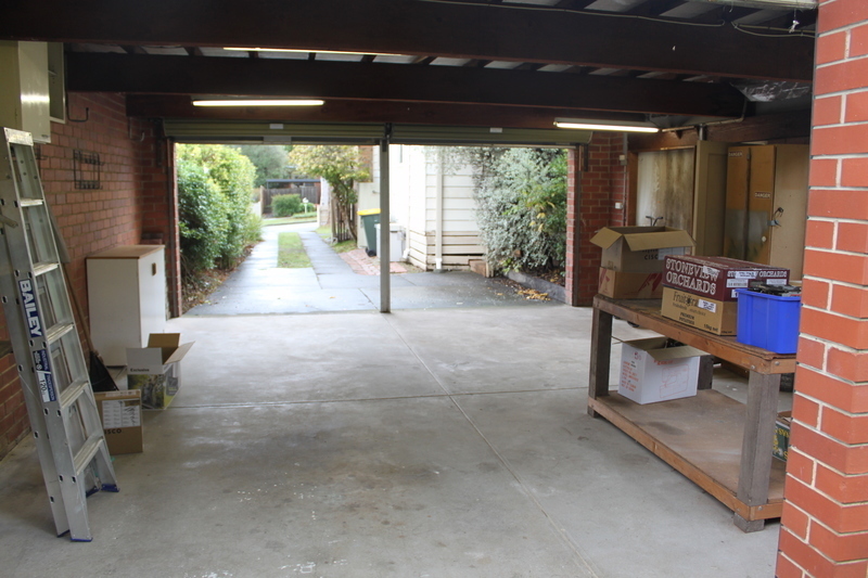 Double lock-up garage (brick) with movable workbench and both front and rear roller doors.
