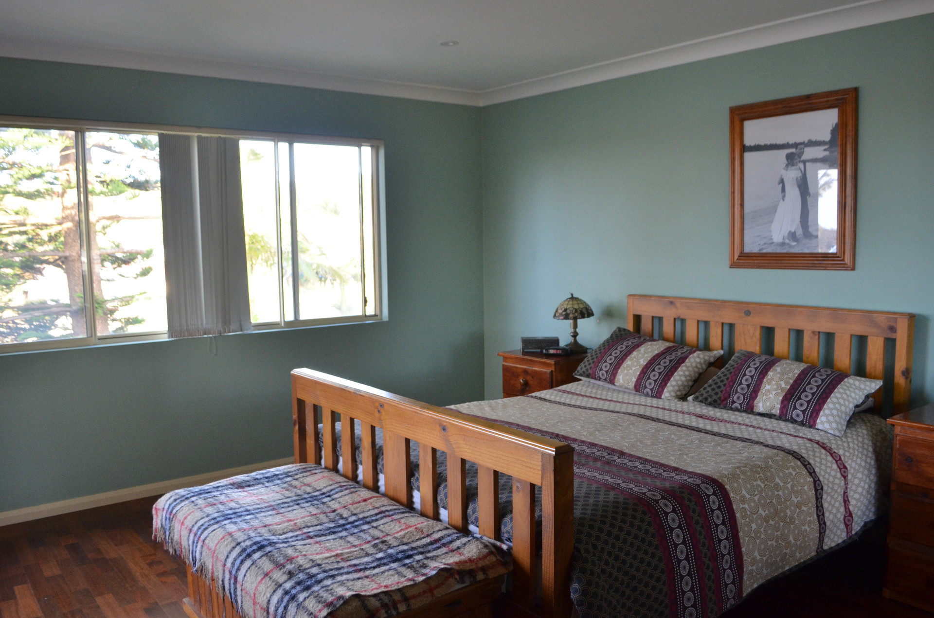The spacious main bedroom also located at the rear of the house has a lovely outlook. It includes a large mirrored built-in robe and ensuite. Open the window at night in summer to enjoy the ocean breeze and sounds.