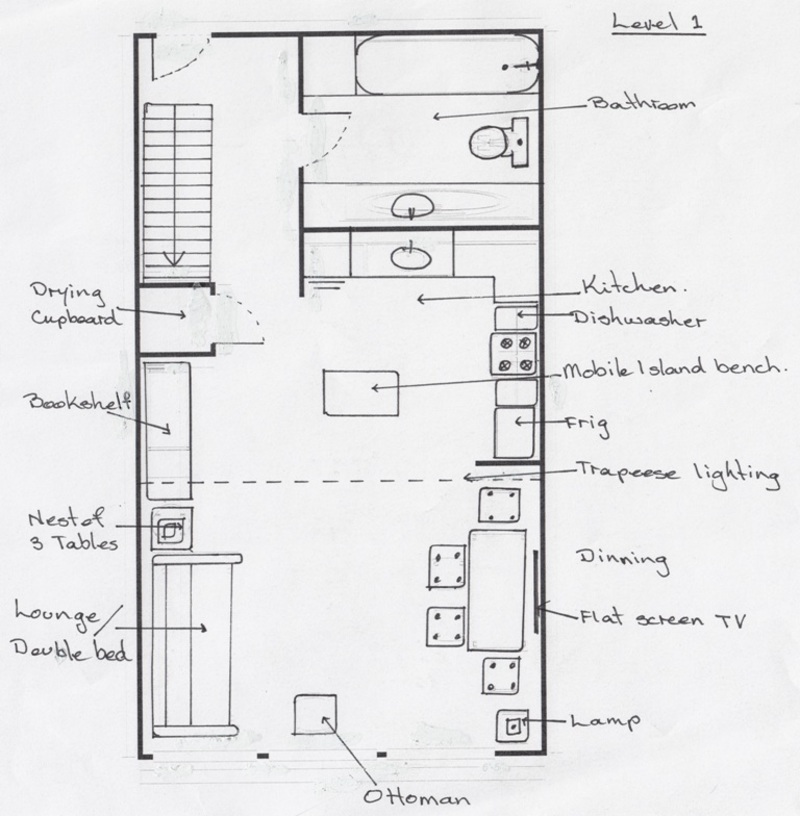 1st level includes a marble bathroom, open plan fully equipped kitchen including a frig, dishwasher & stove, dining area with extendable table if required, lounge/double bed, book shelf with 5 disk stereo system. Plus a flat screen TV which you can enjoy the latest movies through the Hotel system.