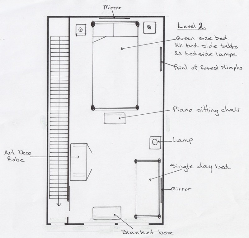The 2nd level includes a 4 Poster Queen size bed with a high quality firm mattress. A single 'sweat as a button' single day bed with fluffy cushions and a lovely Art Deco timber robe. Heating is on both levels.