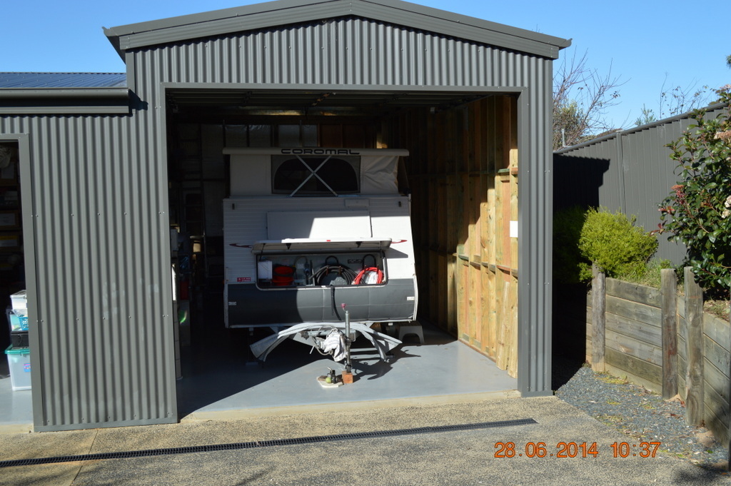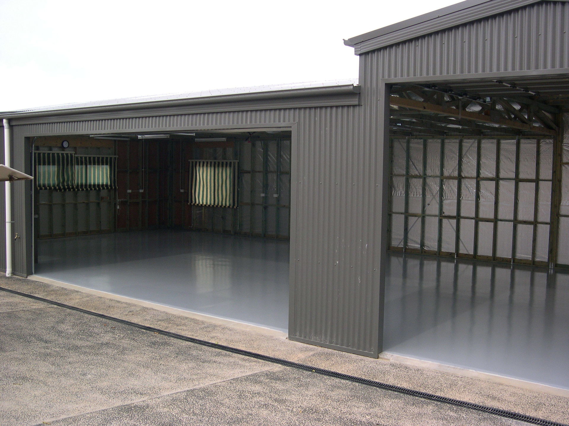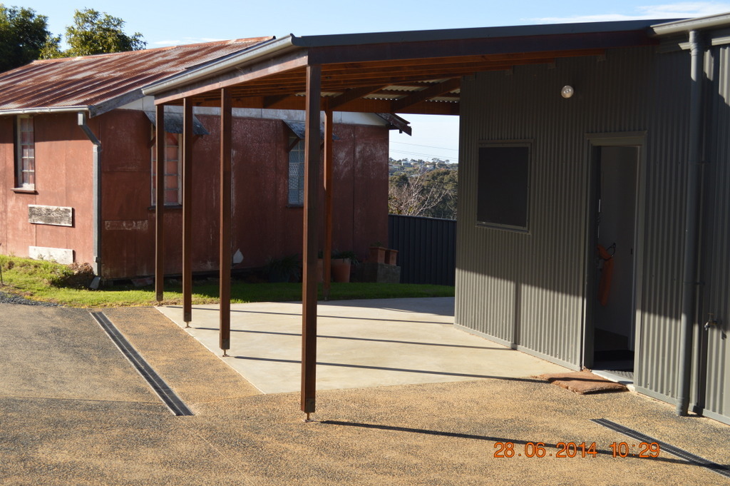 Covered carport / pergola. External concrete forecourt to shed 8 x 19 mtrs.
