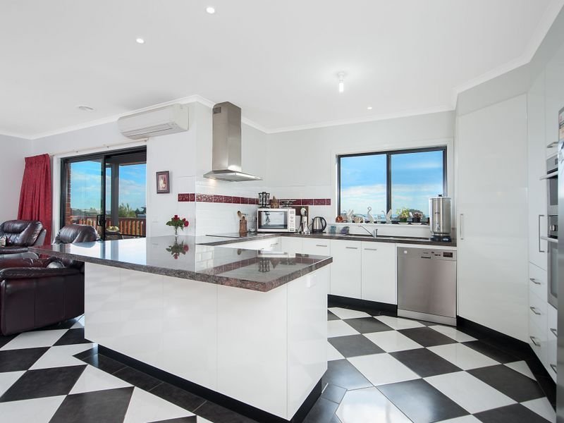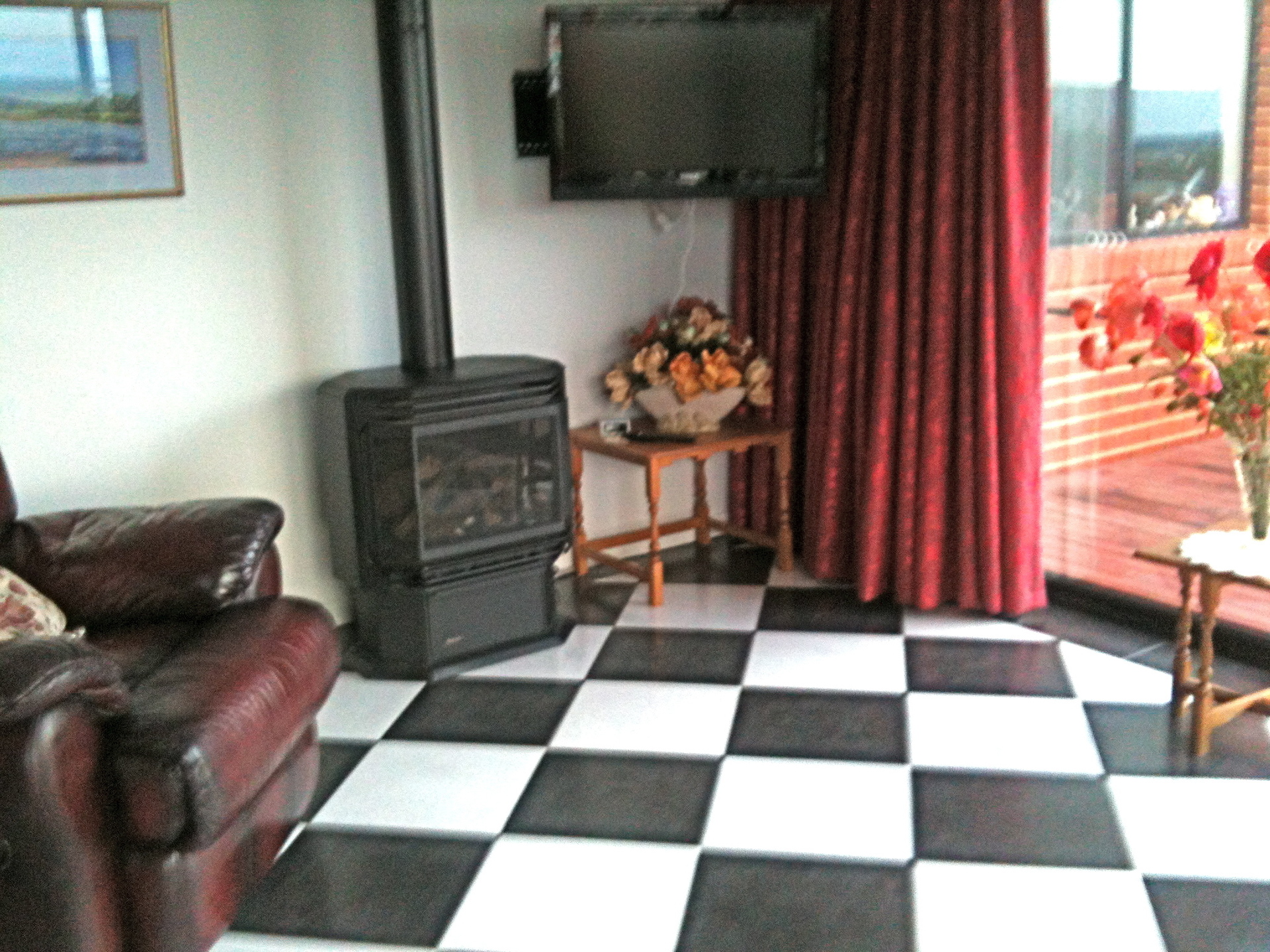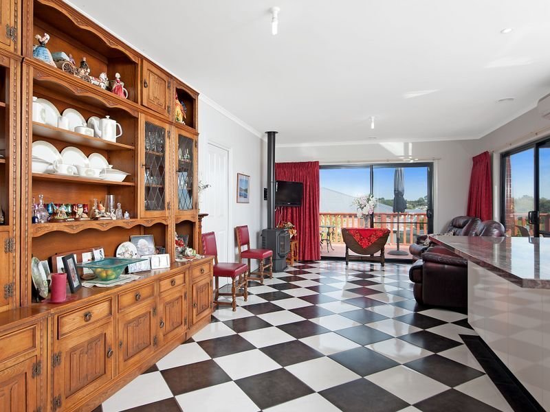 The magnificent view of Colac Lake and Red Rock can be enjoyed from the large sunny decking that wraps around the sitting room. From here you can walk down the ramp to the garden where all the work has been done. It is young yet, but magnificent Beech, camellias , fruit trees and selected deciduous trees promise a beautiful garden before long. There is also a chicken house to match the Tudor design of the house but would also make a great potting shed for garden enthusiasts. All services connected. Underground power. 22700 litre water tank for garden and toilet, reducing water rates.