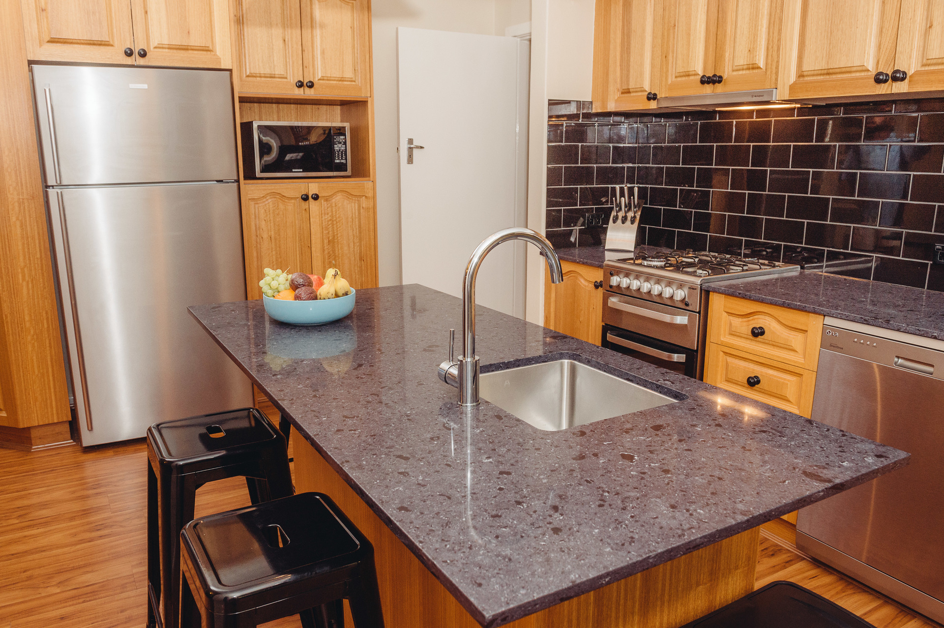 -Timber kitchen with stone bench tops.