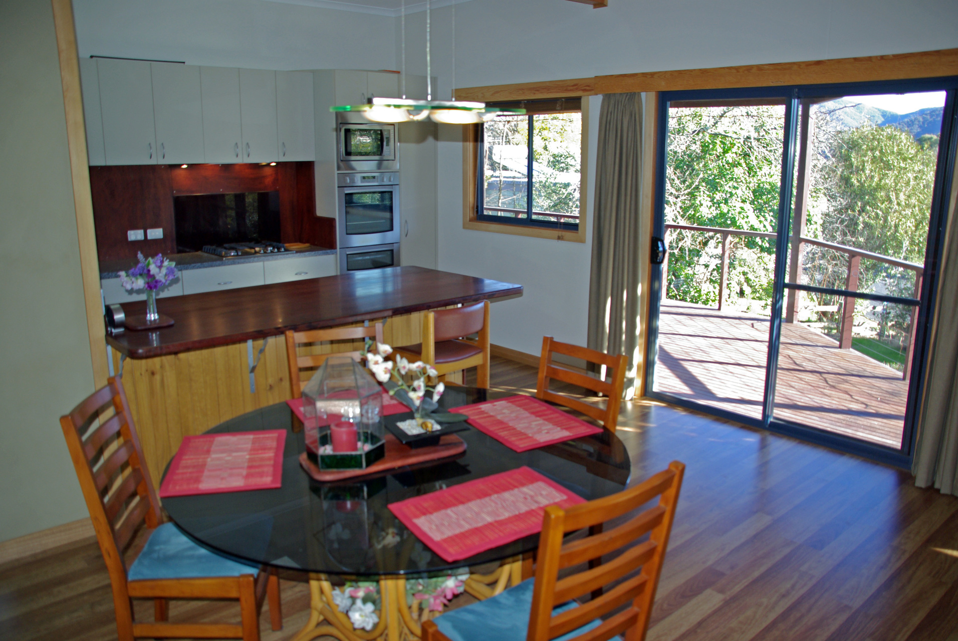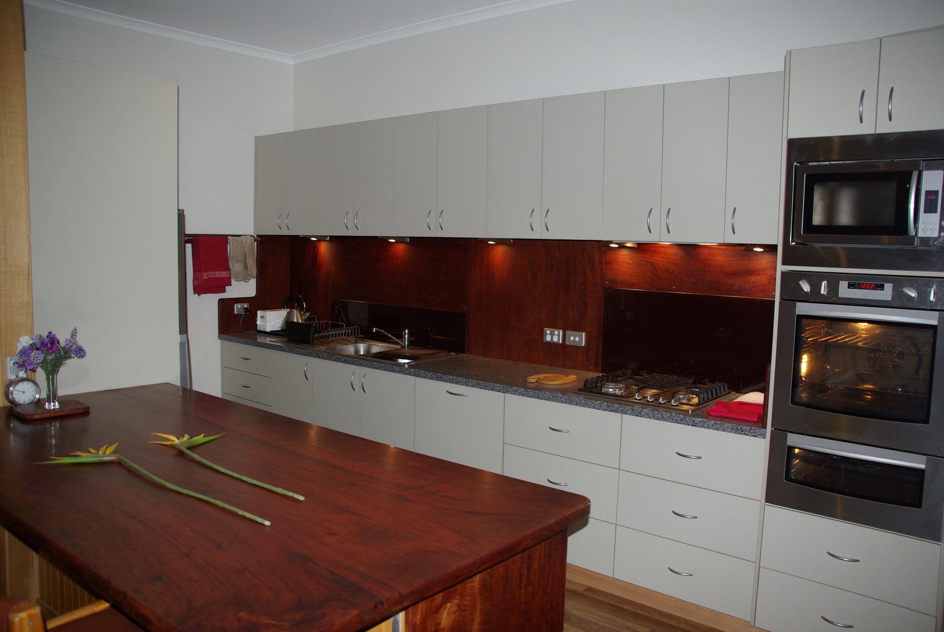 The kitchen has redgum and composite stone bench tops with redgum and glass splash-backs. Appliances include a stainless one and a half wall oven, built in microwave, gas cook-top, large double sink and dishwasher. Overhead there is an opening skylight to provide plenty of light.