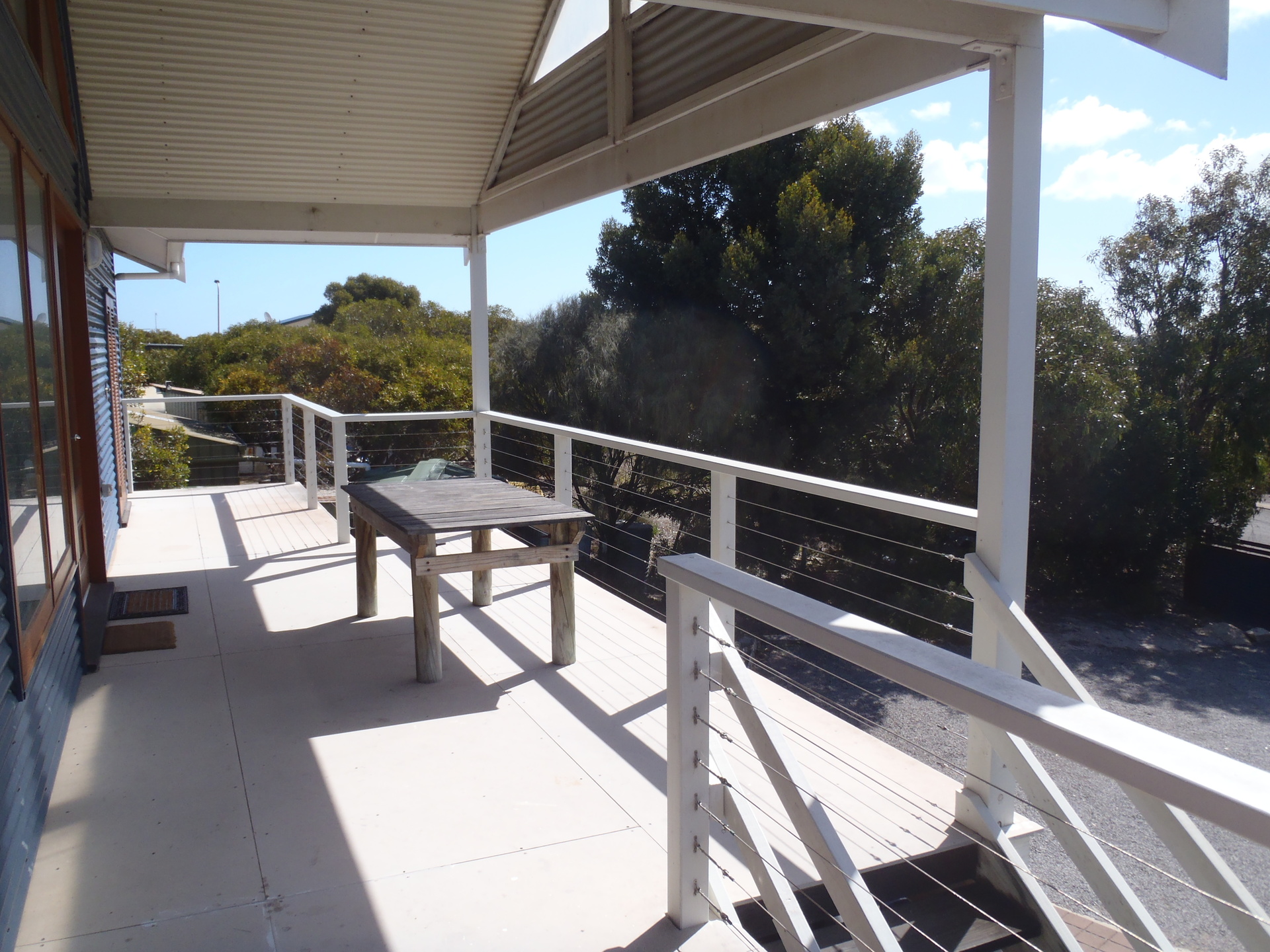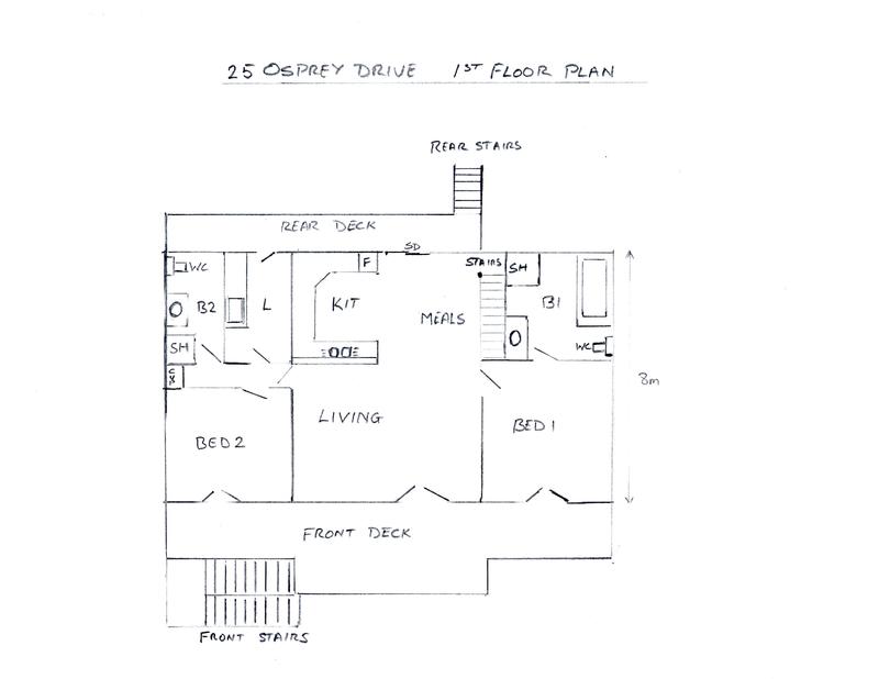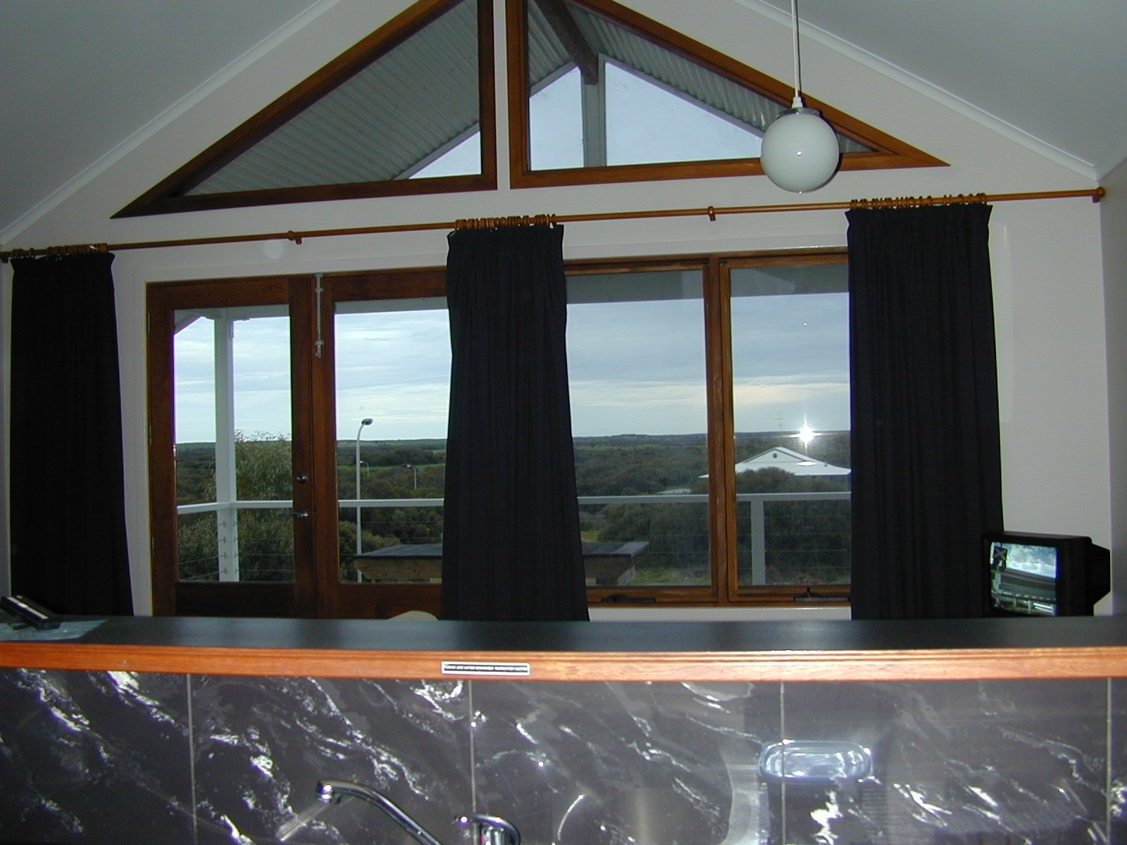 The master bedroom runs off one side of the main living area and has a large en suite bathroom containing toilet, shower and spa bath. A set of cedar French doors leads from this bedroom to the front balcony. The second bedroom runs off the other side of the main living area and also has cedar French doors leading to the front balcony. This side of the house also accommodates the 2nd bathroom and a separate laundry. Both upstairs bedrooms have ceiling fans. The laundry has an internal and an external door which runs on to the rear balcony. The house has a rainwater storage capacity of 45000 litres and is on a septic tank system.
