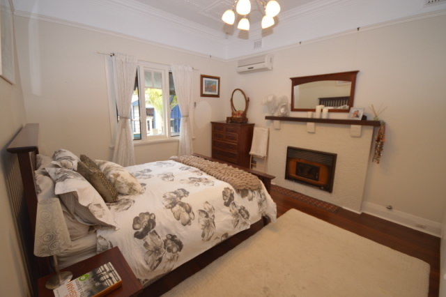 -The Master Bedroom at the front of the house features the original decorative ceiling, picture rails, built in robes, a working fireplace and a split system air-conditioner.