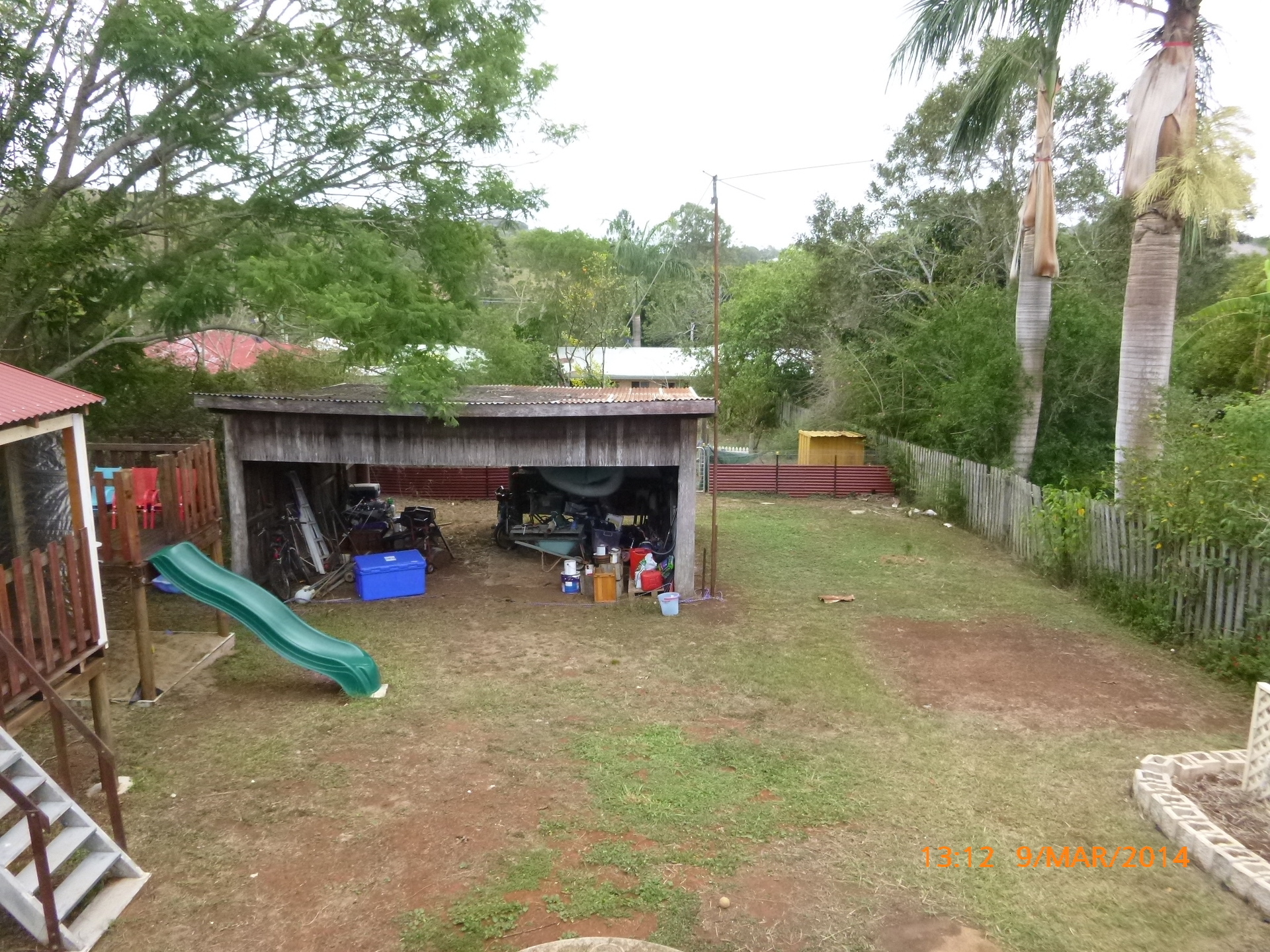 Chicken run and pen plus fruit trees as well as a large macadamia nut tree.