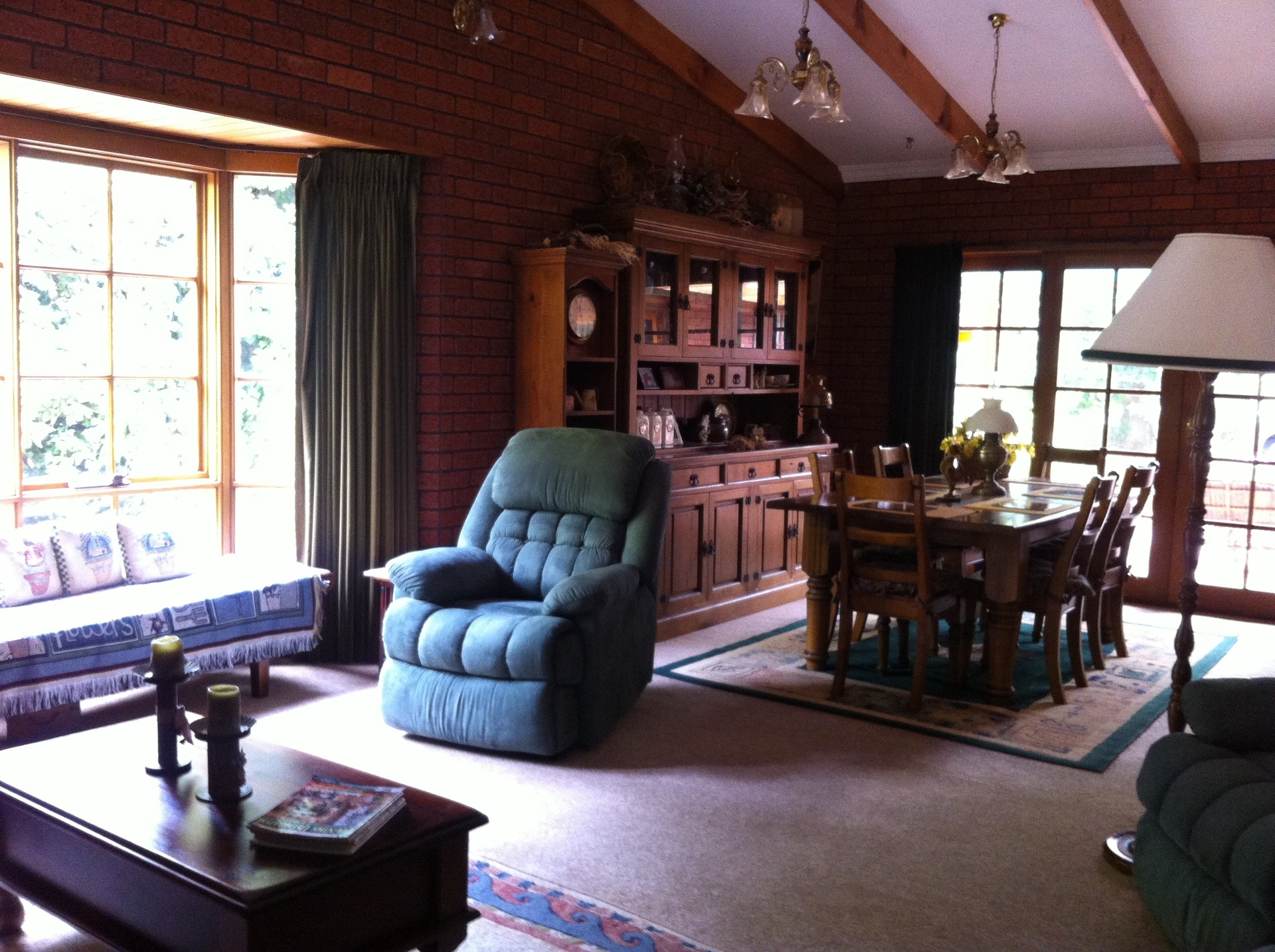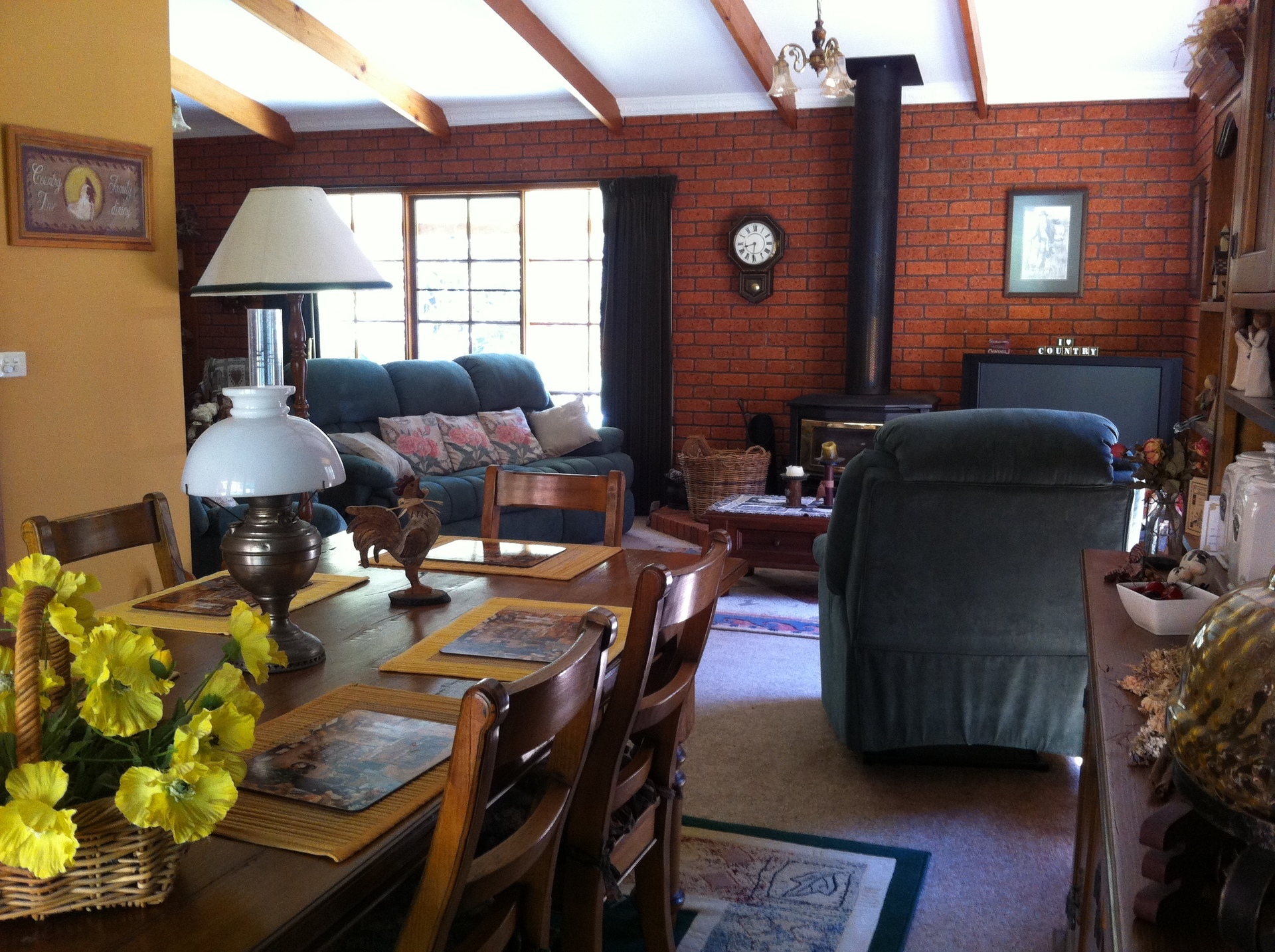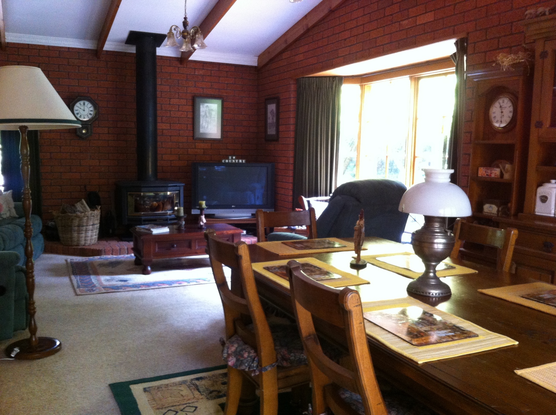 This quality brick home features brick and timber interior, bay windows and cathedral ceilings. Large windows around each side of the main living area take advantage of the peaceful outlook, while French doors flow from the adjacent dining area to an undercover bbq and entertaining area. A large kitchen with breakfast bar flows through to a second living area which includes another wood heater in addition to that in the main living area. Additionally there is an expansive room equipped with bar, fridge cavity, sink and bench, direct access outdoors and to bathroom/toilet for entertaining/rumpus or independent living quarters for family.