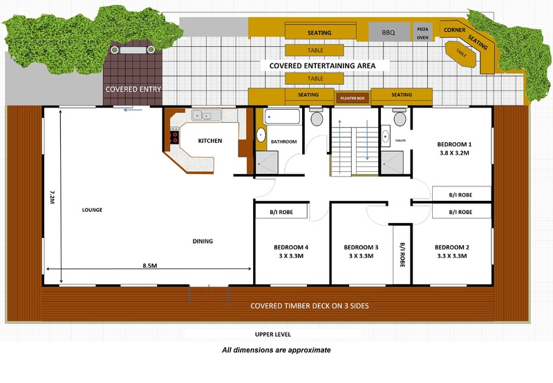 The upper level has a large open plan lounge / kitchen / dining area, bathroom and separate toilet, four bedrooms one with en-suite.