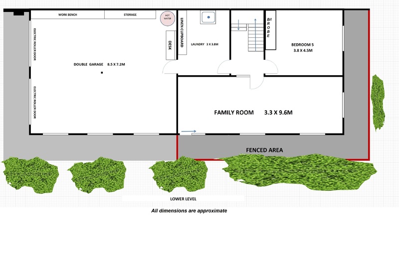 The lower level has a large two car garage with two electric roller doors, a large Laundry, huge family / rumpus room and one bedroom.