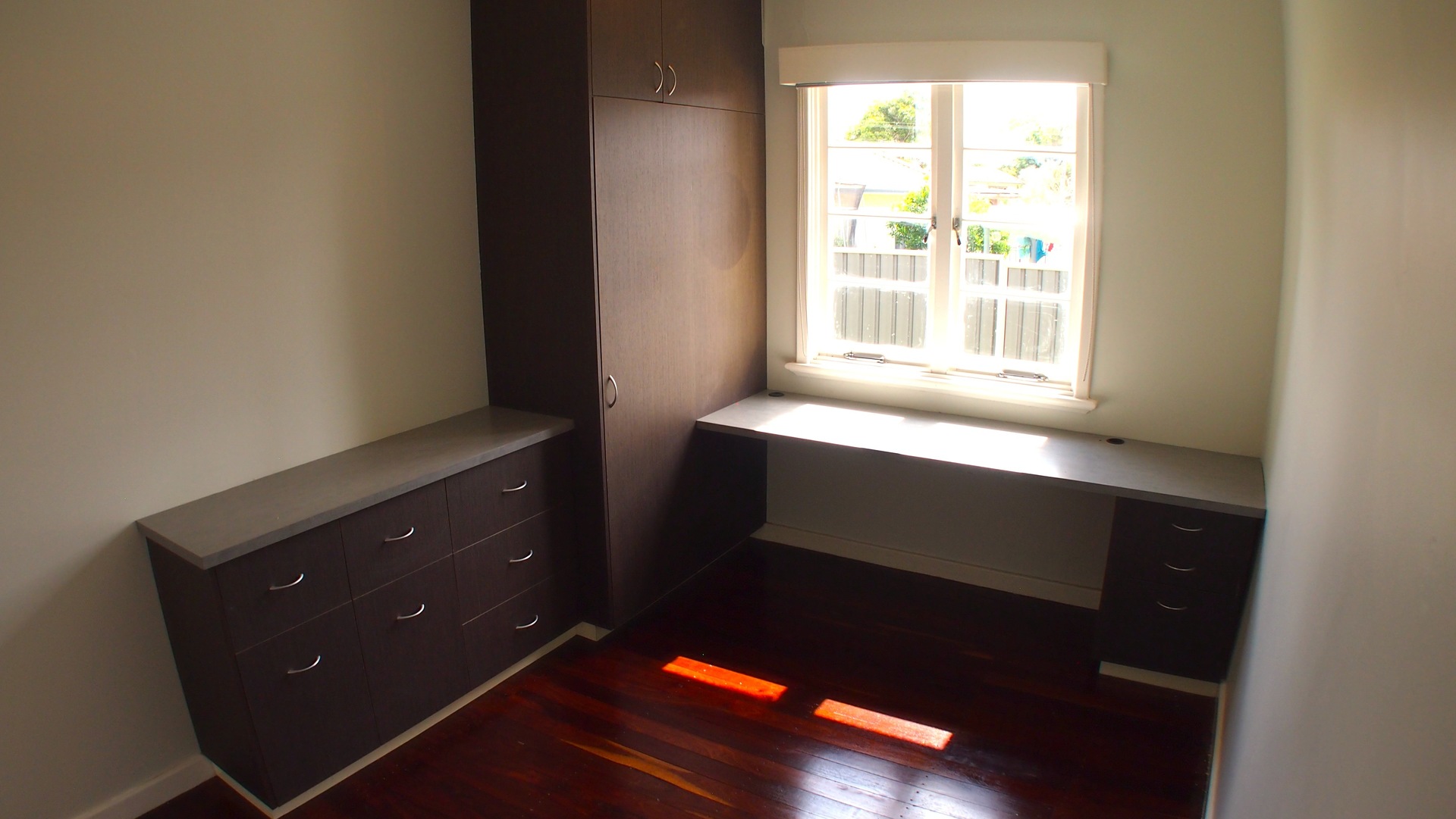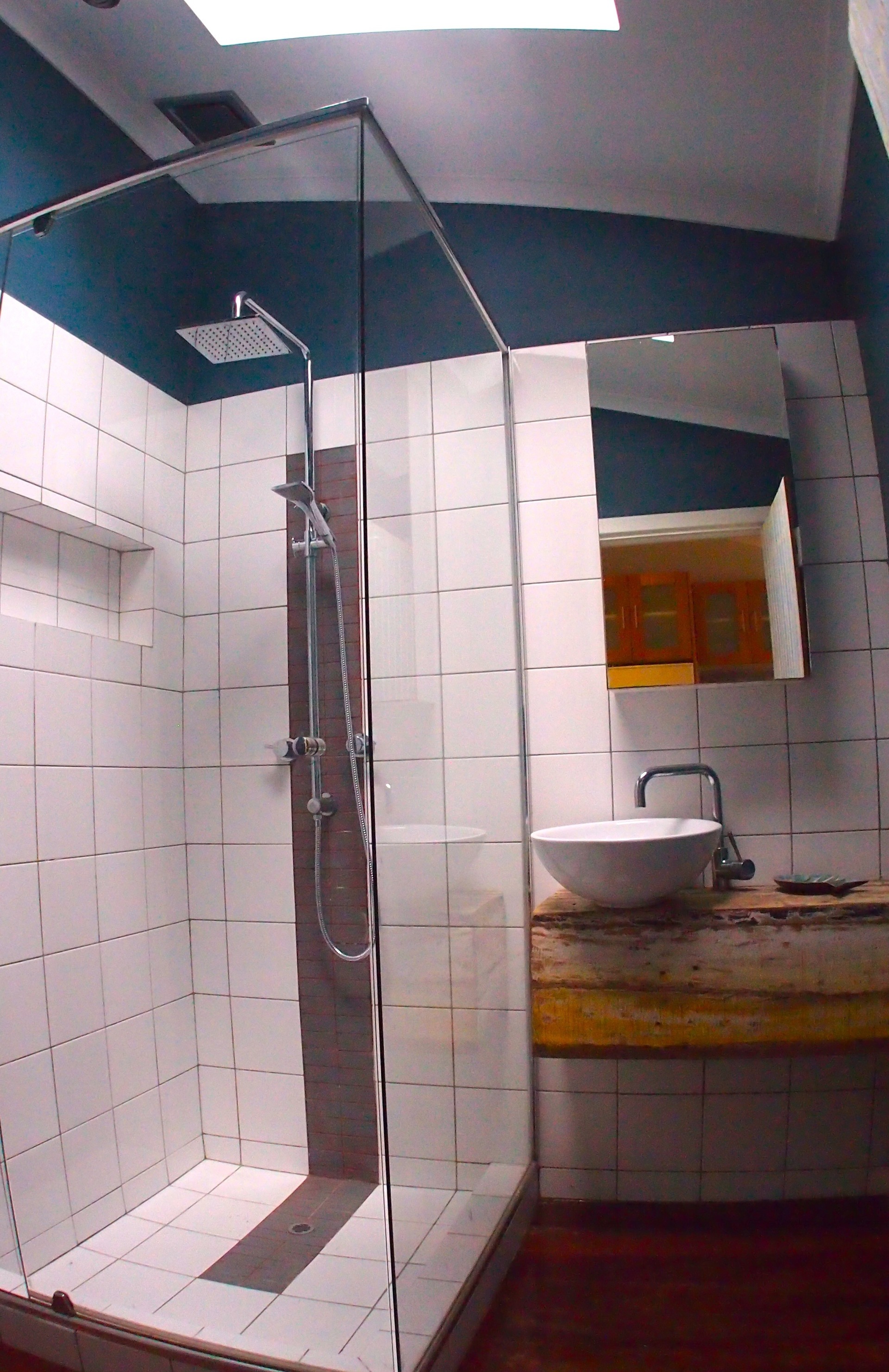 Beautifully designed kitchen with jarrah bench tops and glass splash-backs