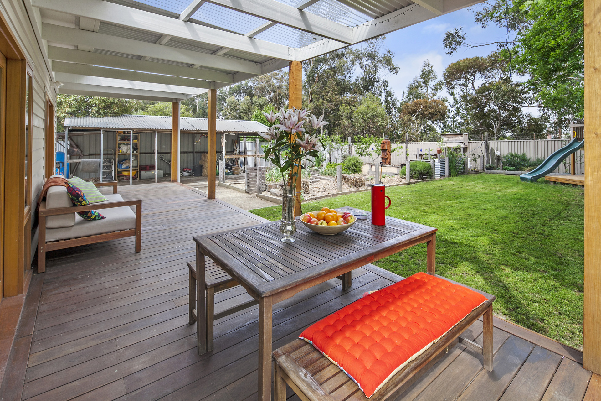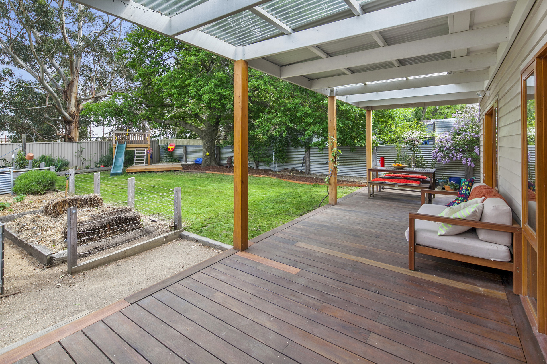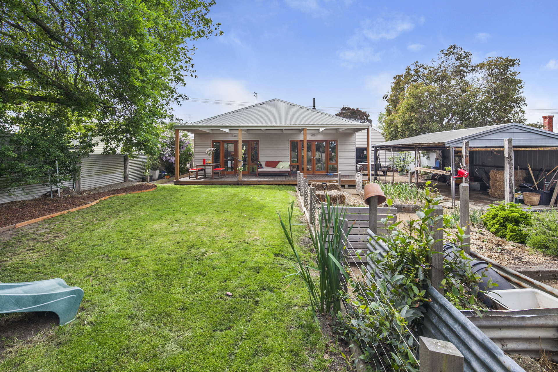Outside, there is a new double garage with automatic doors at front and back, leading to a drive and third carport/garage. The backyard is ideal for families or garden enthusiasts, featuring a magnificent oak tree, along with a well-defined vegetable garden, a variety of fruit trees, a large grassed area and a fantastic children’s play-castle. Â