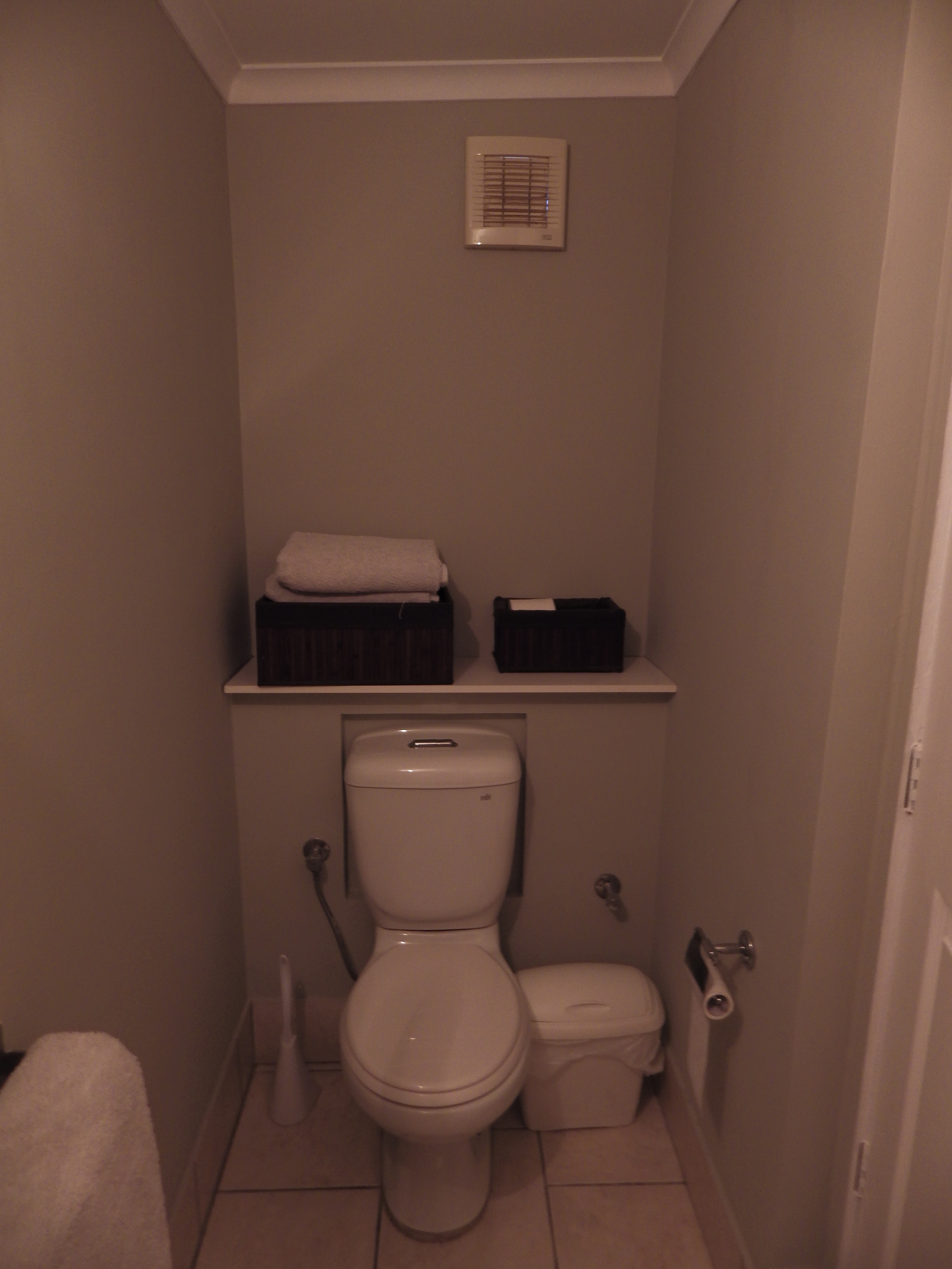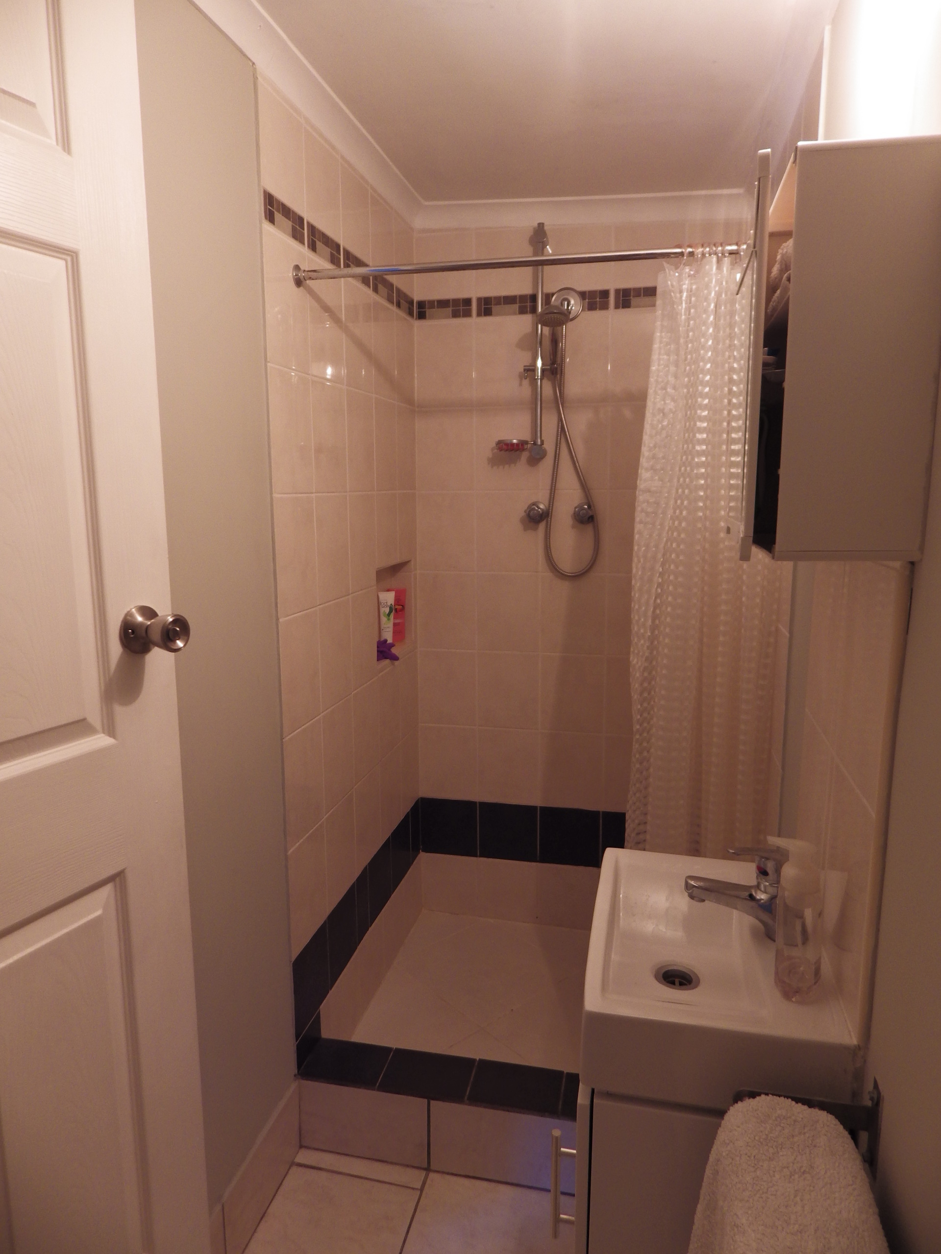 Built in work top with linen cupboard & cupboards above plus extra storage & tiled floor.