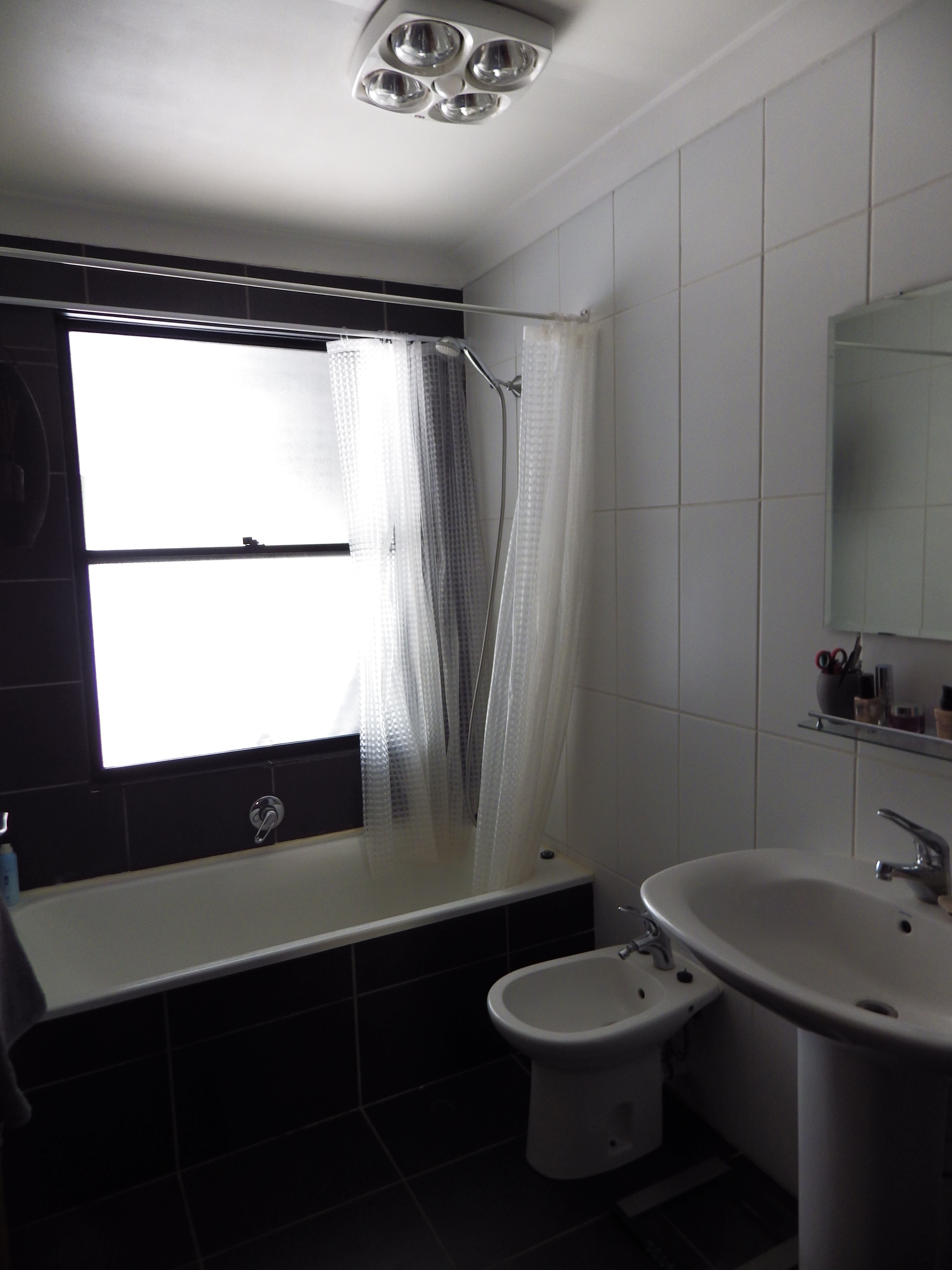 Shower over bath, free standing wash basin & bidet built in shelves to wall, tiled floor, heat globes.