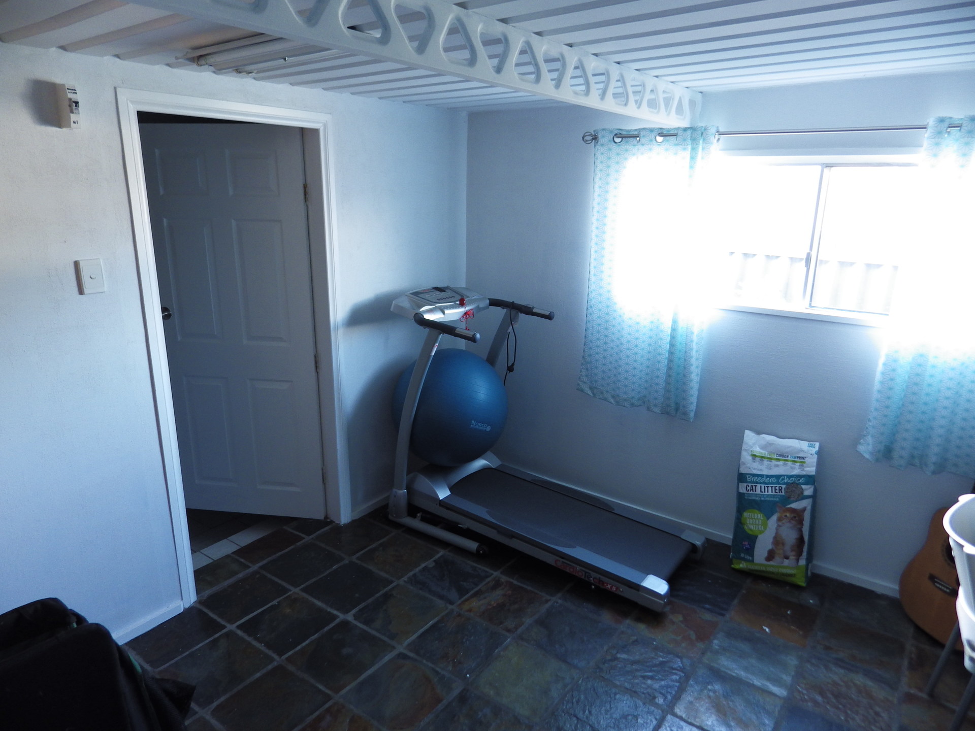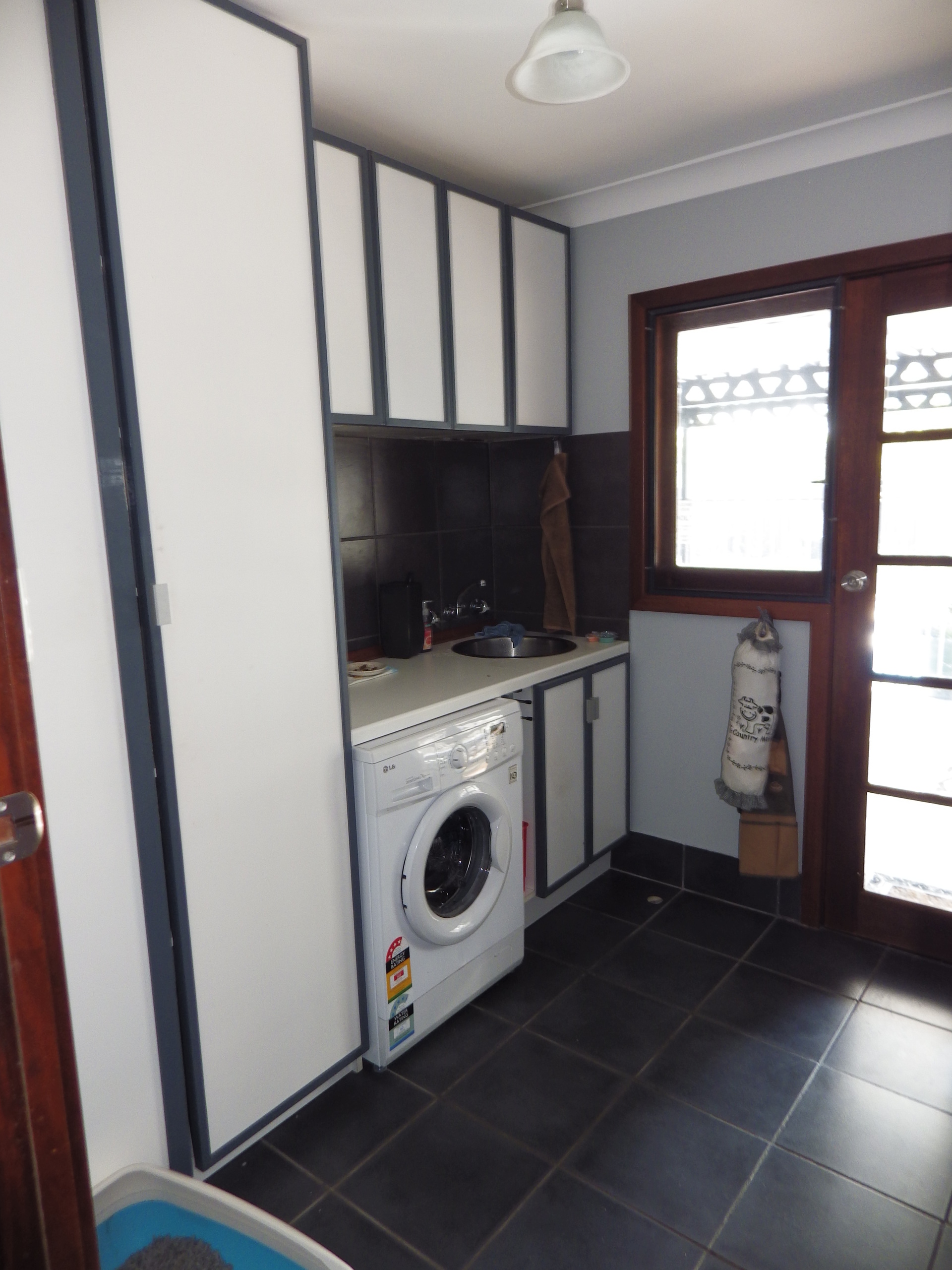 Off laundry, tiled floor , heat globes.
