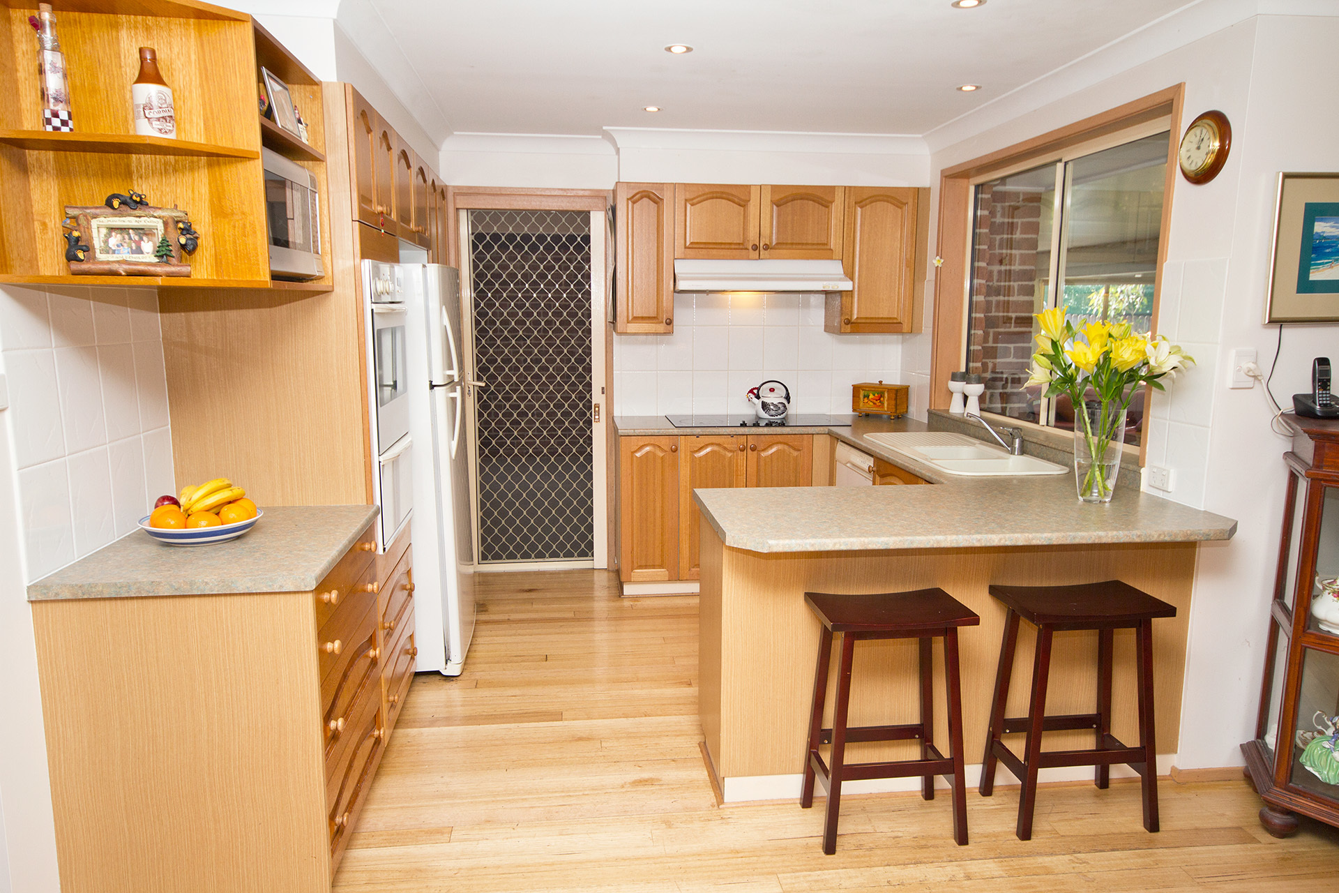 • Open plan pine kitchen with plenty of bench and cupboard space