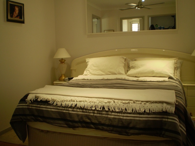 The guest bedroom has full wall cupboards and easily takes a double bed and it has a small airconditioner. The third bedroom is much smaller also with build in full wall cupboards which could get a single bed into but is used as an office.