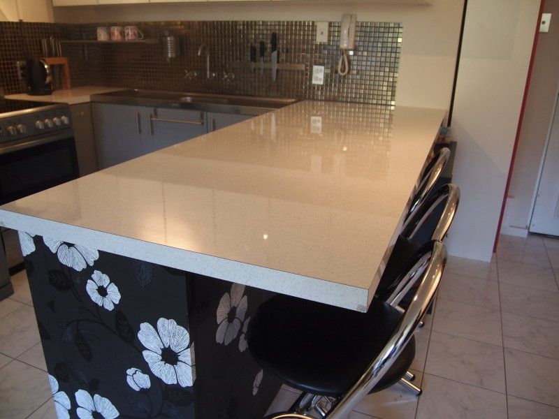 High-gloss bench top and overhead cabinets