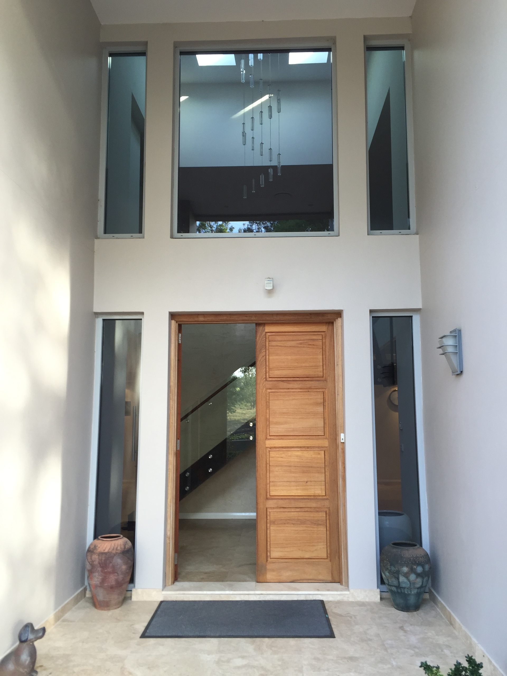 • Large timber entry doors that open up to 5 mtr high sky light ceiling with exquisite hanging feature light