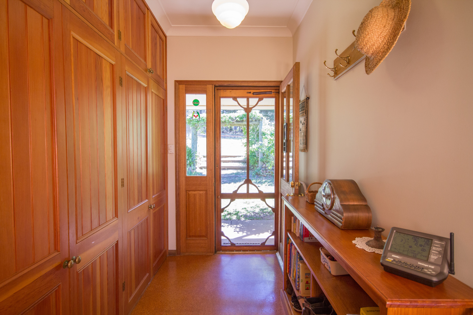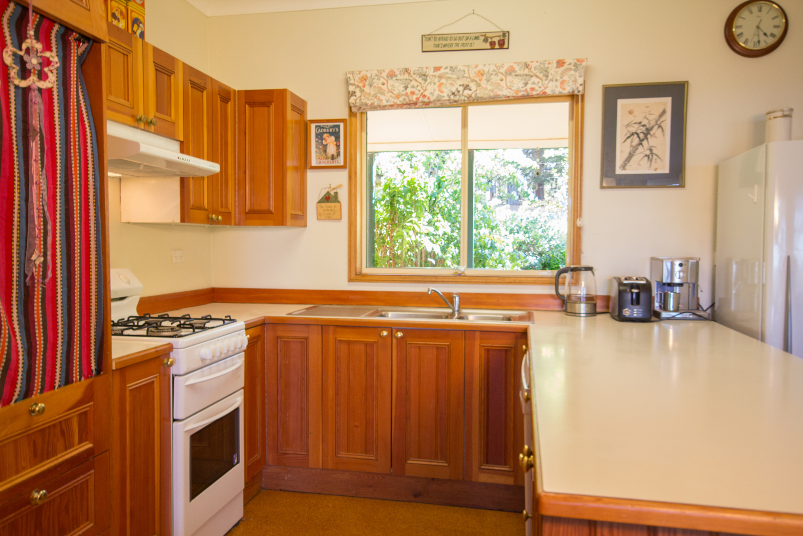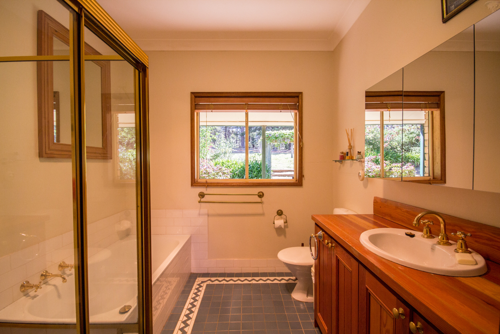 The kitchen features lovely Tasmanian Oak timber doors to the cupboards, a modern gas stove, outside venting range hood and a modern Bosch dishwasher. The bathroom has a lovely country feel, with plenty of timber and lovely tile patterns with sparkling brass fittings.
