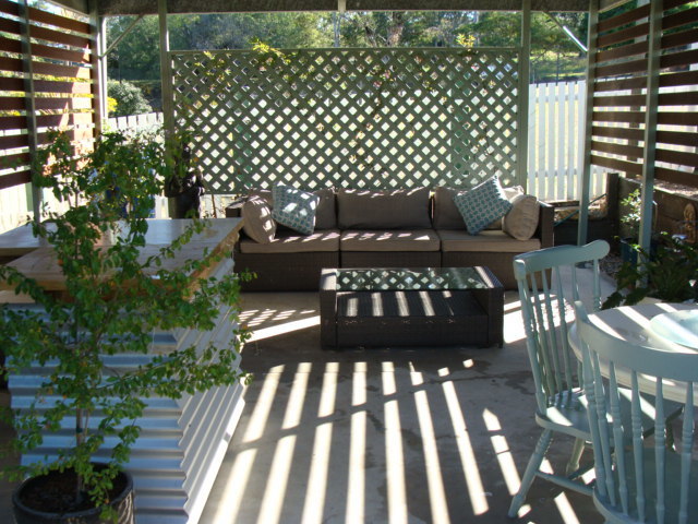 There is a second separate living area, with sliding cedar door leading out onto a sheltered paved area.