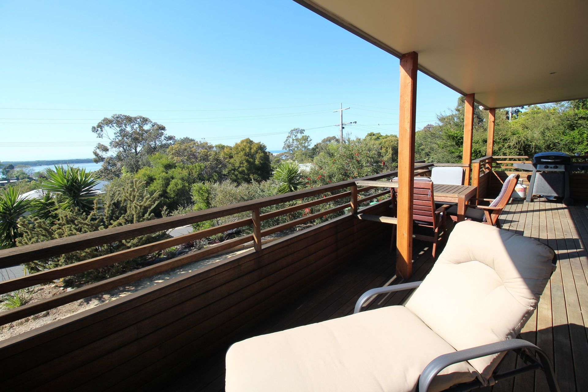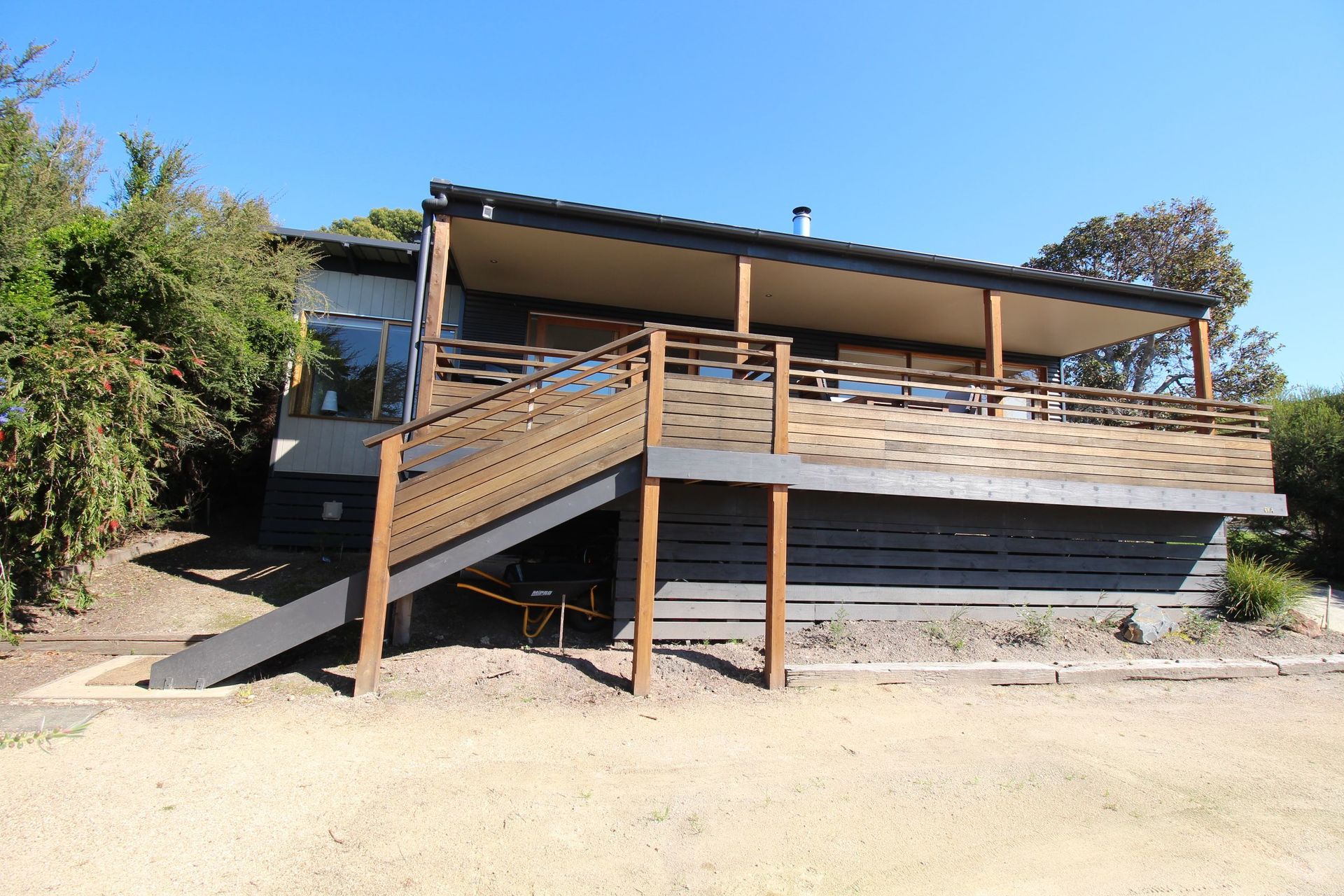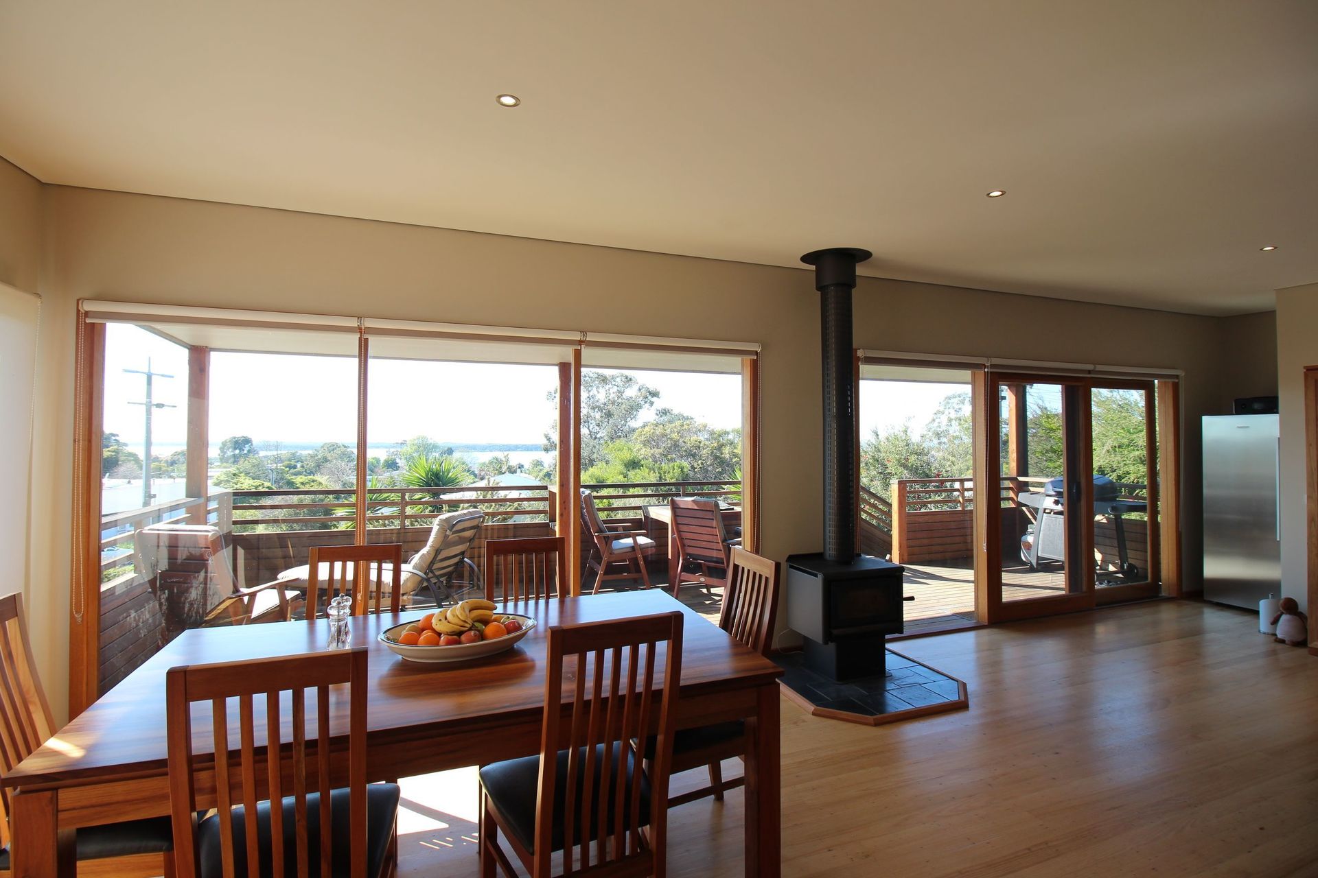 Modern two bedroom home built in 2012. This spacious open plan design with timber flooring has a wood heater, reverse cycle air conditioner and is wired for satellite television. There are large windows which fill the house with light and warmth. The decking provides extensive views of the bottom lake, ocean, entrance and the Howe Ranges.