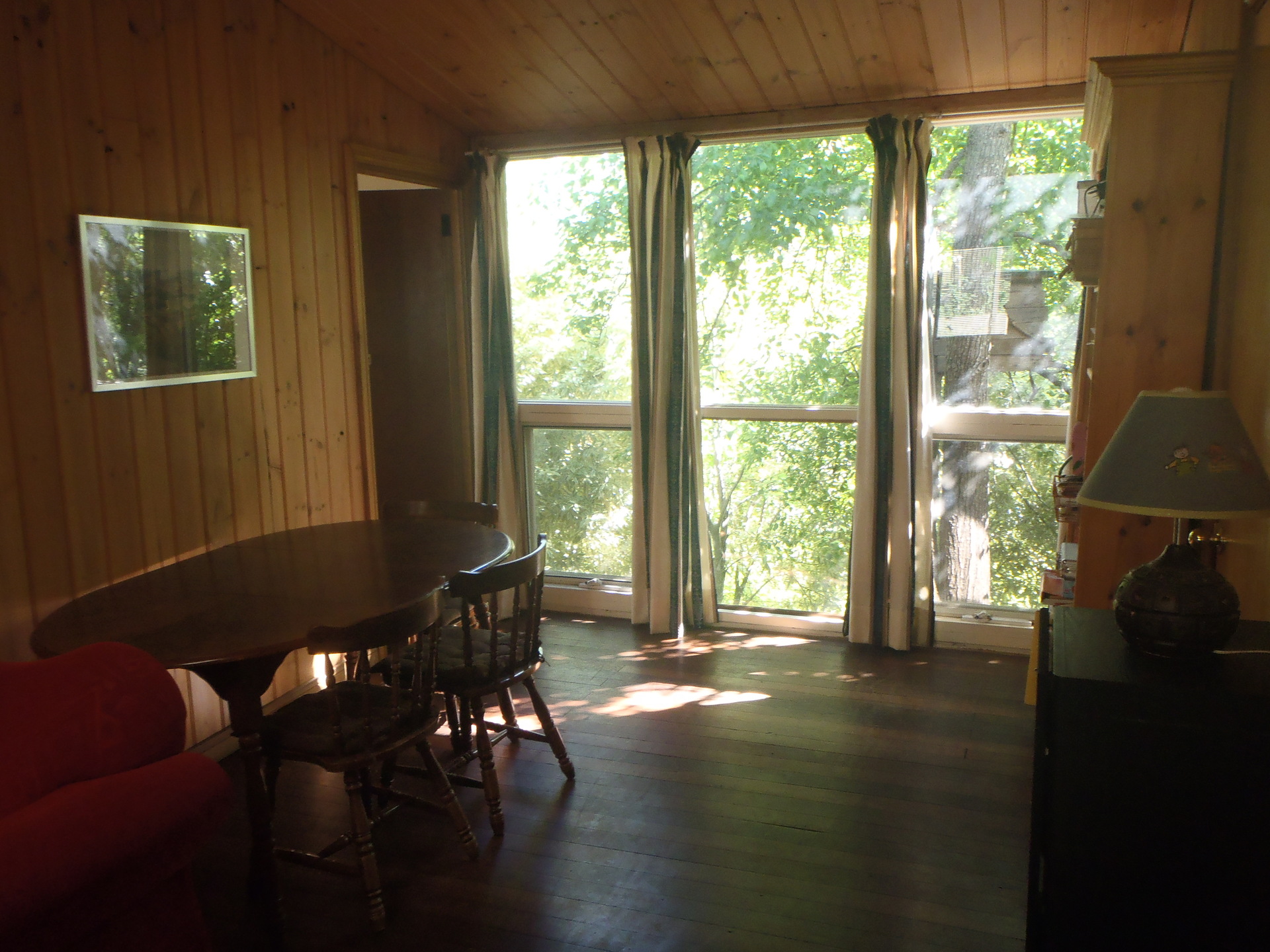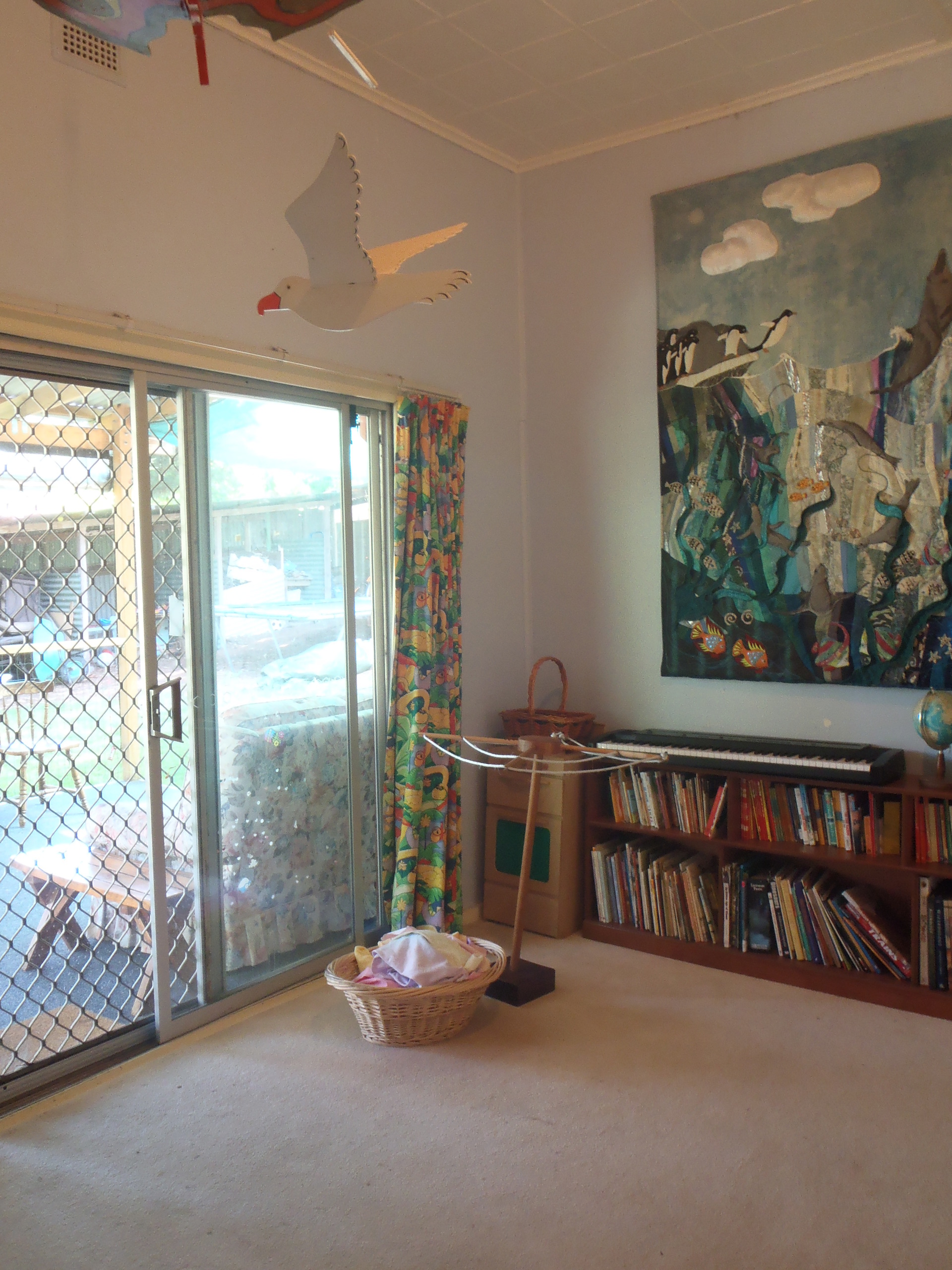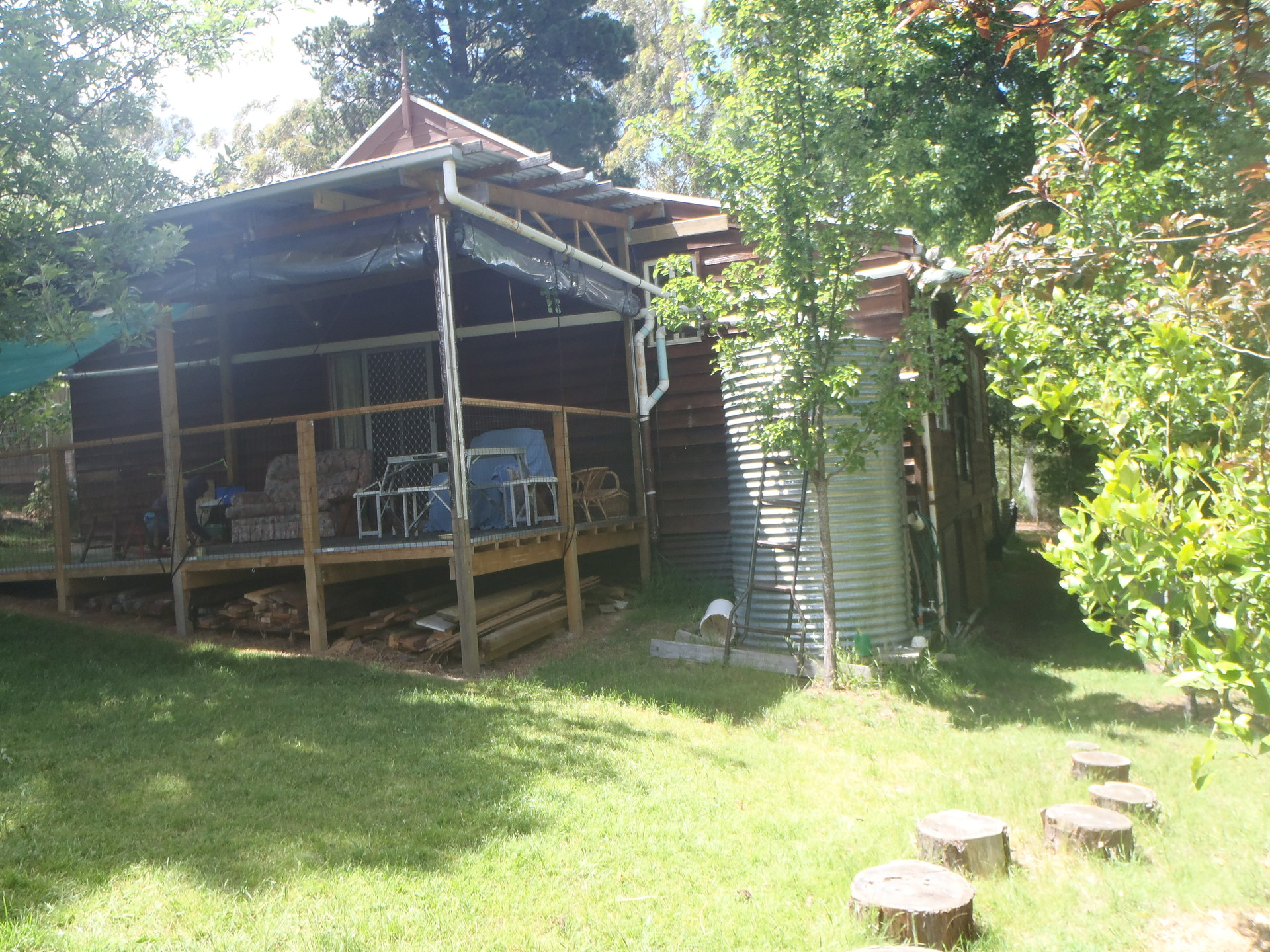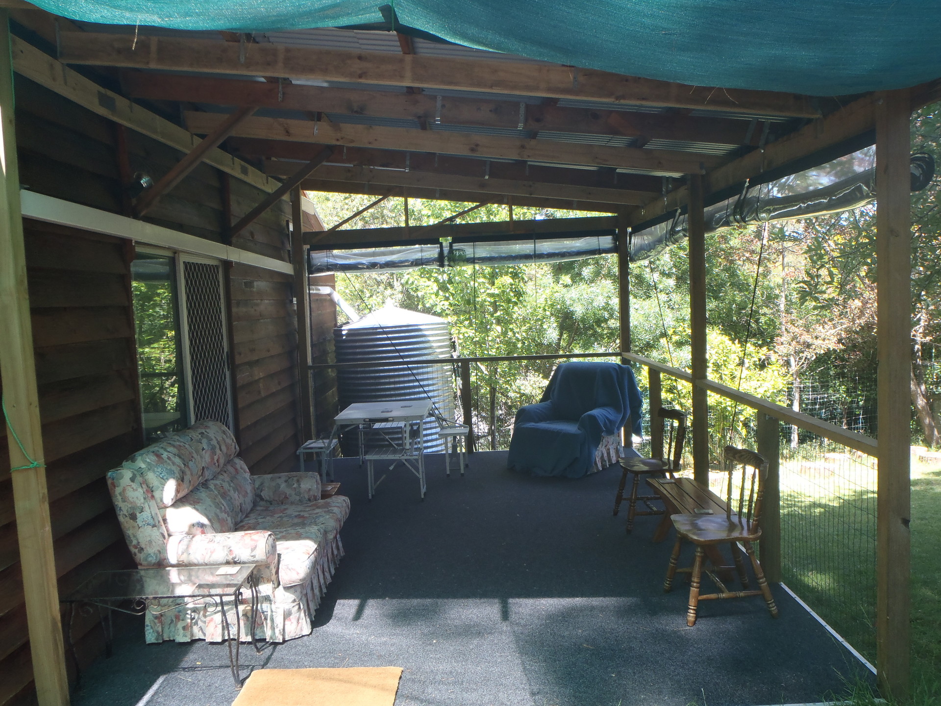 The newly built, covered deck at the back of the house with cafe blinds and carpet is the perfect family gathering place; a place to enjoy meals or for children's play to sprawl out through all the weather.